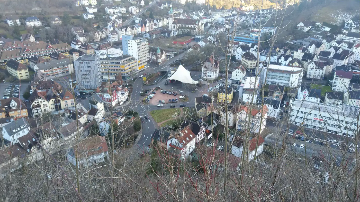 Nach einem Anstieg öffnet sich der Blick zurück auf Schramberg. Wir stehen oberhalb des Tals und erkennen die Stadt in ihrer gesamten Ausdehnung. Die Dächer und Straßen wirken von hier oben geordnet und ruhig. Der Aussichtspunkt bildet einen spannenden Kontrast zur engen Tallage, die wir zuvor durchquert haben.Kirchturm der St. Maria Kirche