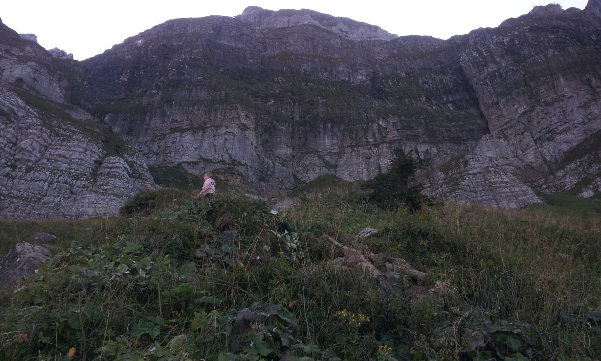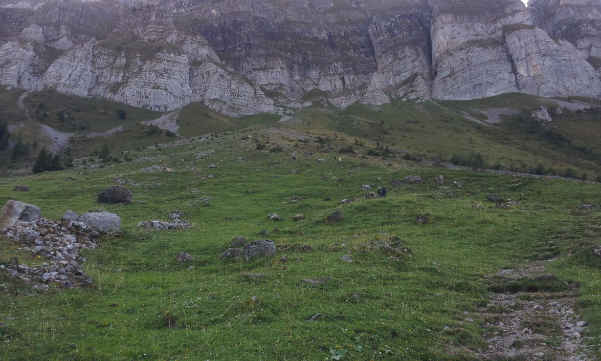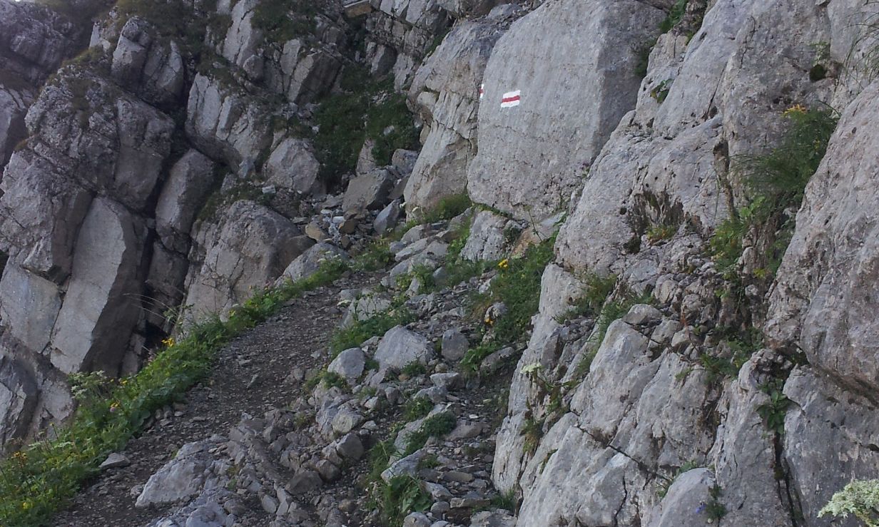 Nach der Felsbastion führt der Weg durch ein breites, schräg verlaufendes Gras- und Geröllband, das sich entlang der steil aufragenden Nordwände des Alpsteins zieht. Hier bieten sich eindrucksvolle Blicke in die steile Wandstruktur, die von geologischen Kräften über Jahrmillionen geformt wurde. Kalkfelsen, Dolinen, Karrenfelder - ein Paradies für Geologen und Liebhaber alpiner Szenerie.Berggasthaus Tierwies