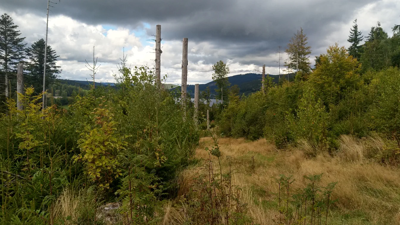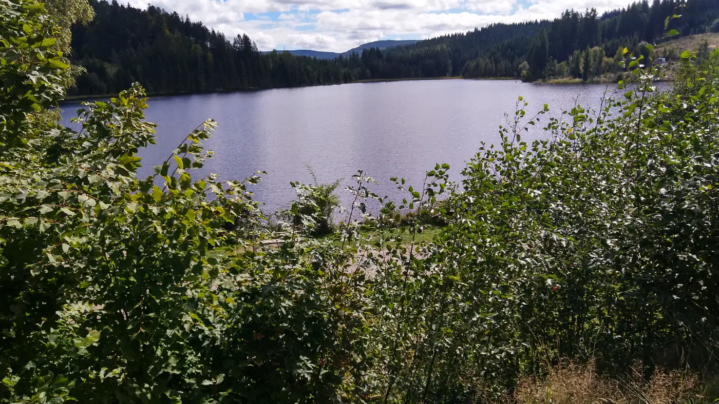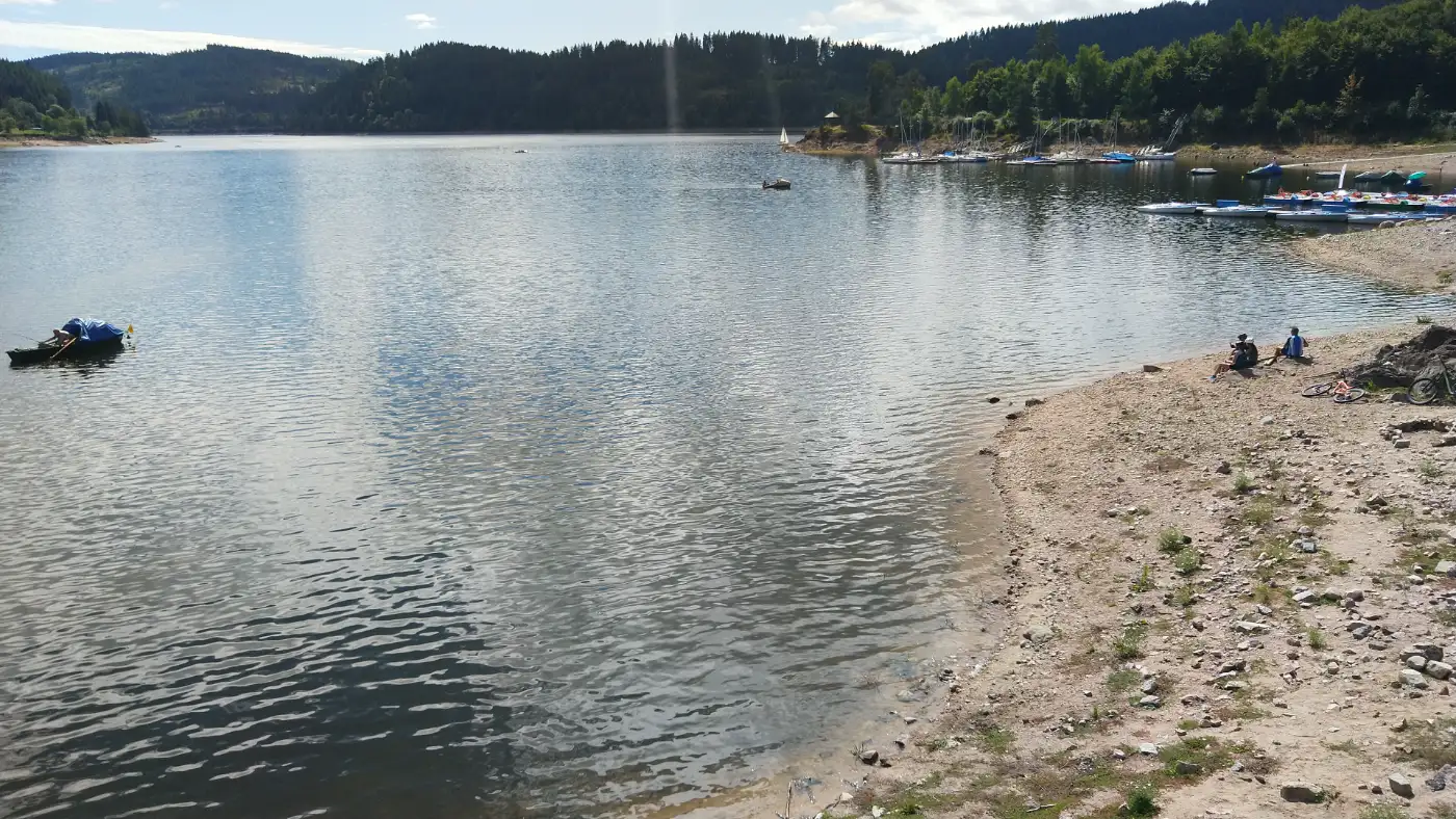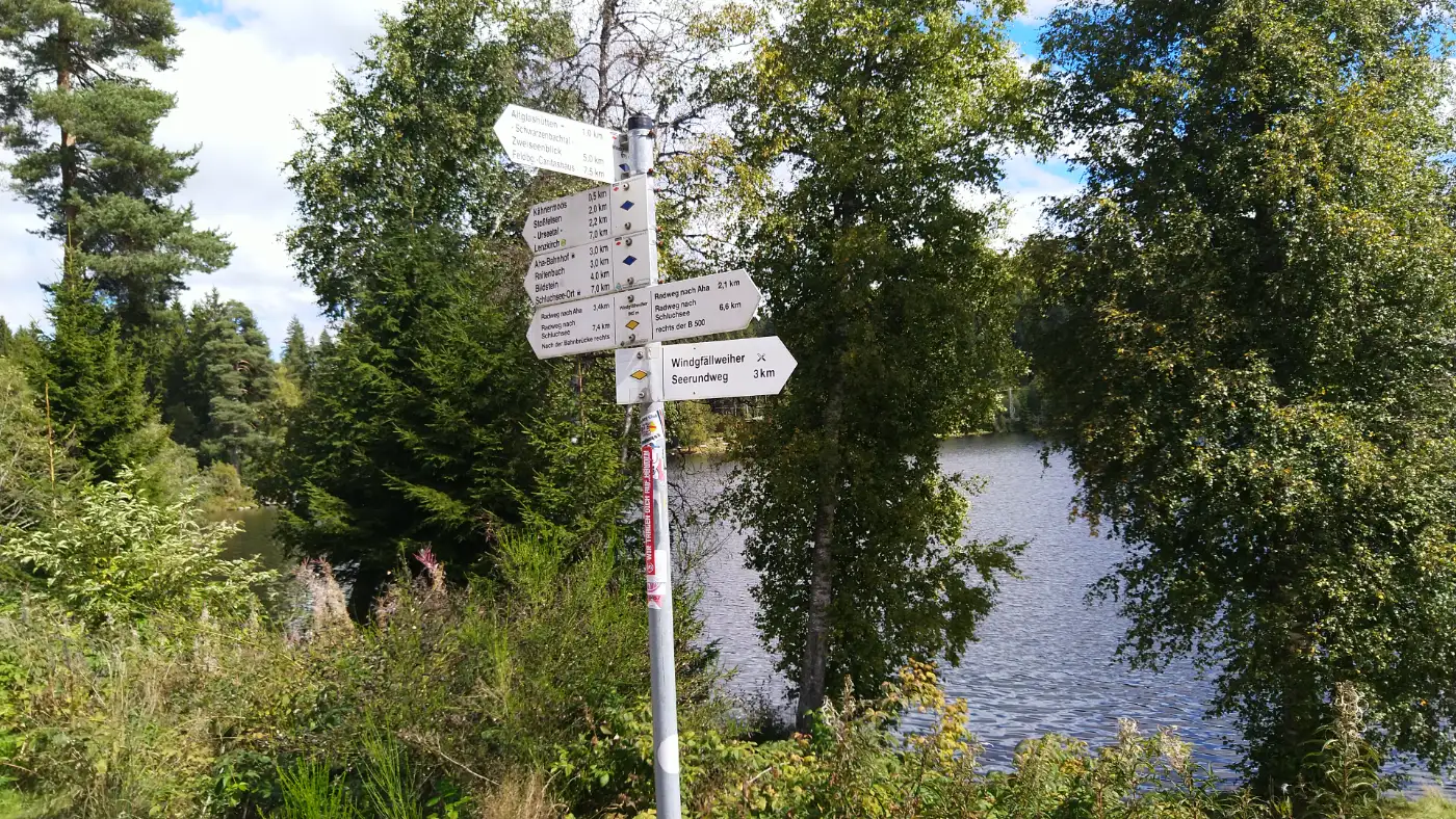 Zu Beginn verläuft unser Weg zwischen dem Ufer des Schluchsees und der parallel führenden Bahntrasse. Dadurch erleben wir die besondere Kombination aus Wasserlandschaft und Schienenweg hautnah. Der Schluchsee selbst ist der größte See im Schwarzwald und beeindruckt durch seine Weite, die fast schon an einen Fjord erinnert. Immer wieder öffnen sich kleine Zugänge zum Wasser, die zum Schwimmen und Baden einladen, während hinter uns das leise Rattern vorbeifahrender Züge zu hören ist. Diese Mischung aus Naturidylle und lebendiger Bahnstrecke macht den Abschnitt besonders abwechslungsreich und unverwechselbar.Der Windgfällweiher