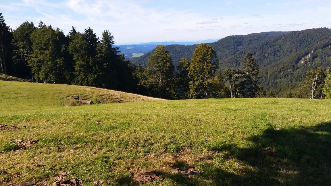 Oben auf dem Rohrhardsberg angekommen, werden wir mit einem grandiosen Ausblick belohnt. Vor uns liegt das Rheintal, weit ausgebreitet und bei klarer Sicht bis zu den Vogesen erkennbar. Die Landschaft wirkt wie ein riesiges Mosaik aus Weinbergen, Dörfern und Flussläufen. Wir verweilen einige Minuten, lassen den Blick schweifen und genießen das Gefühl, den höchsten Punkt der Etappe erreicht zu haben. Hier oben offenbart sich die ganze Weite des Schwarzwaldes - und mit etwas Glück erblicken wir sogar das Straßburger Münster, das wie eine kleine Spitze am Horizont auftaucht. Ein Fernglas mitzunehmen lohnt sich, um dieses besondere Detail noch klarer erkennen zu können.Aussicht - Schwäbische Alb