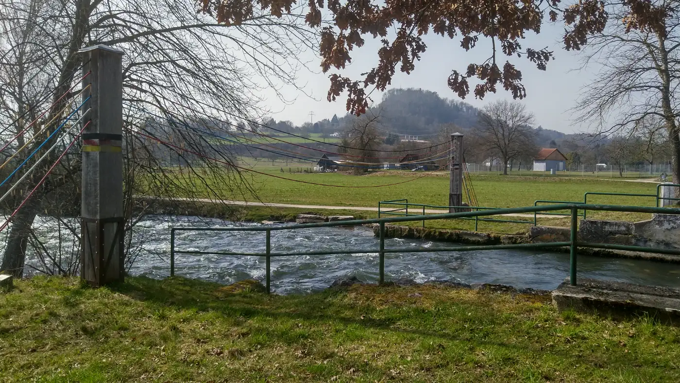 Kurz darauf erreichen wir die grüne >em>Aachinsel, eine kleine Naturoase zwischen den Armen der Radolfzeller Aach. Der Fluss begleitet uns nun auf einem ruhigen Abschnitt der Strecke. Hohe Bäume spenden Schatten, und das Wasser fließt ruhig neben dem Radweg dahin. Wir fahren durch eine überraschend stille Landschaft, obwohl die Stadt nicht mehr weit entfernt ist.Aachmündung