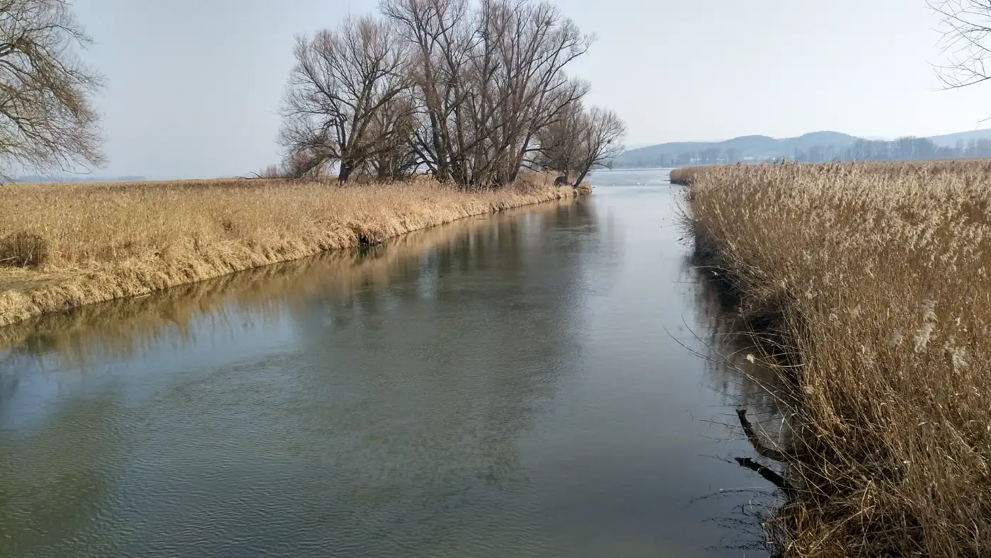 Wenig später öffnet sich die Landschaft, und wir gelangen zur Aachmündung. Hier mündet die Radolfzeller Aach in den Bodensee und bildet eine geschützte Uferzone mit Schilfgürteln und flachen Wasserflächen. Wir halten kurz an und beobachten das Spiel von Wasser und Wind. Wasservögel ziehen ihre Bahnen über die ruhige Oberfläche, während sich am Horizont bereits die Weite des Sees abzeichnet.Mole Radolfzell