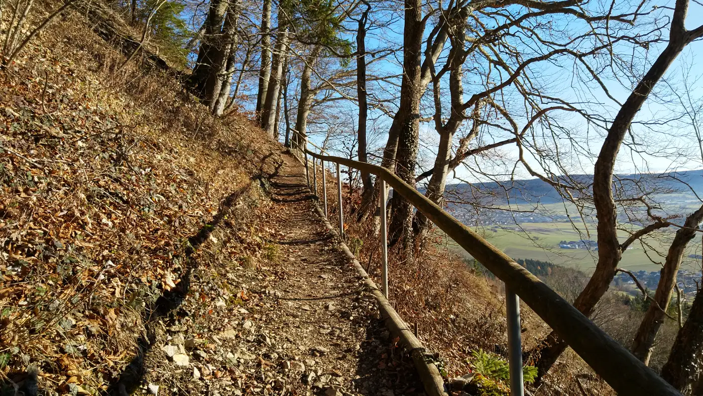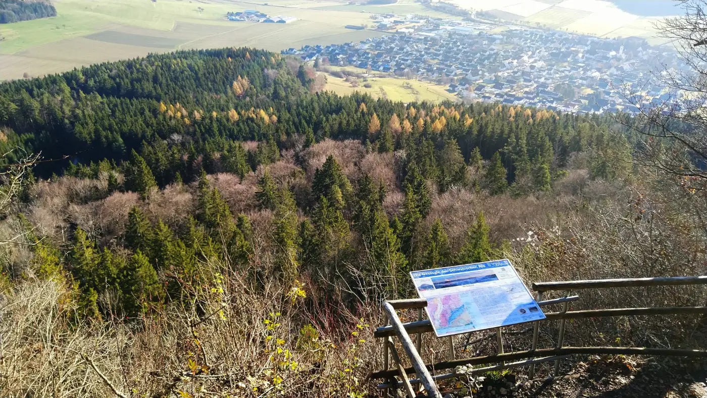 Oben auf dem Höhenzug öffnet sich der Blick unvermittelt in die Tiefe. Unter uns liegt Rietheim-Weilheim, eingebettet in das Faulenbachtal, während sich rundherum die weiten Hochflächen der Schwäbischen Alb ausbreiten. Die erhöhte Lage macht diesen Punkt zu einem idealen Platz für eine kurze Pause. Bei klarer Sicht reicht das Panorama bis zu den Alpen, und wir nehmen bewusst die klare Struktur von Tal, Ortschaft und Höhenlinien wahr.Auf dem Dreifaltigkeitsberg