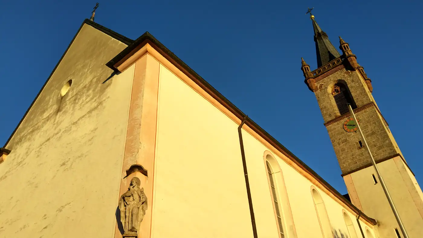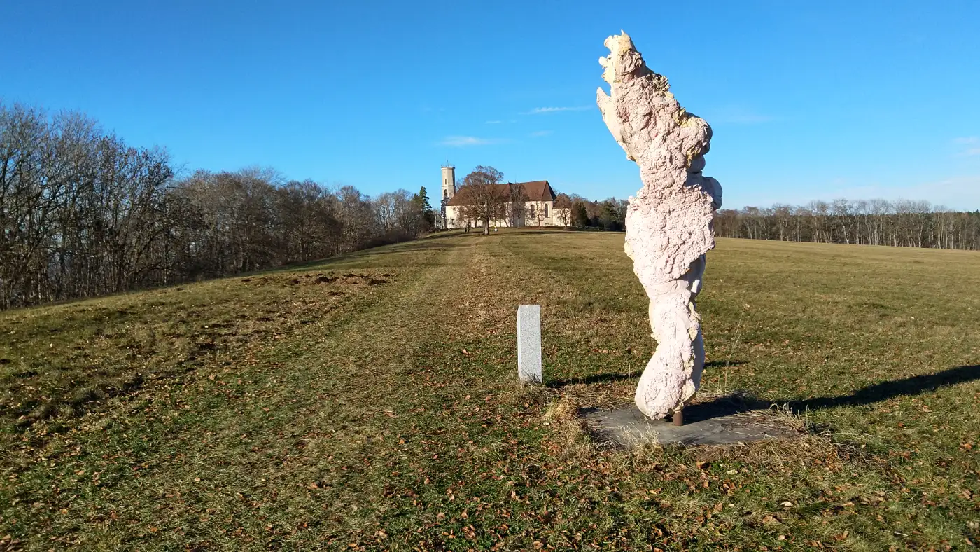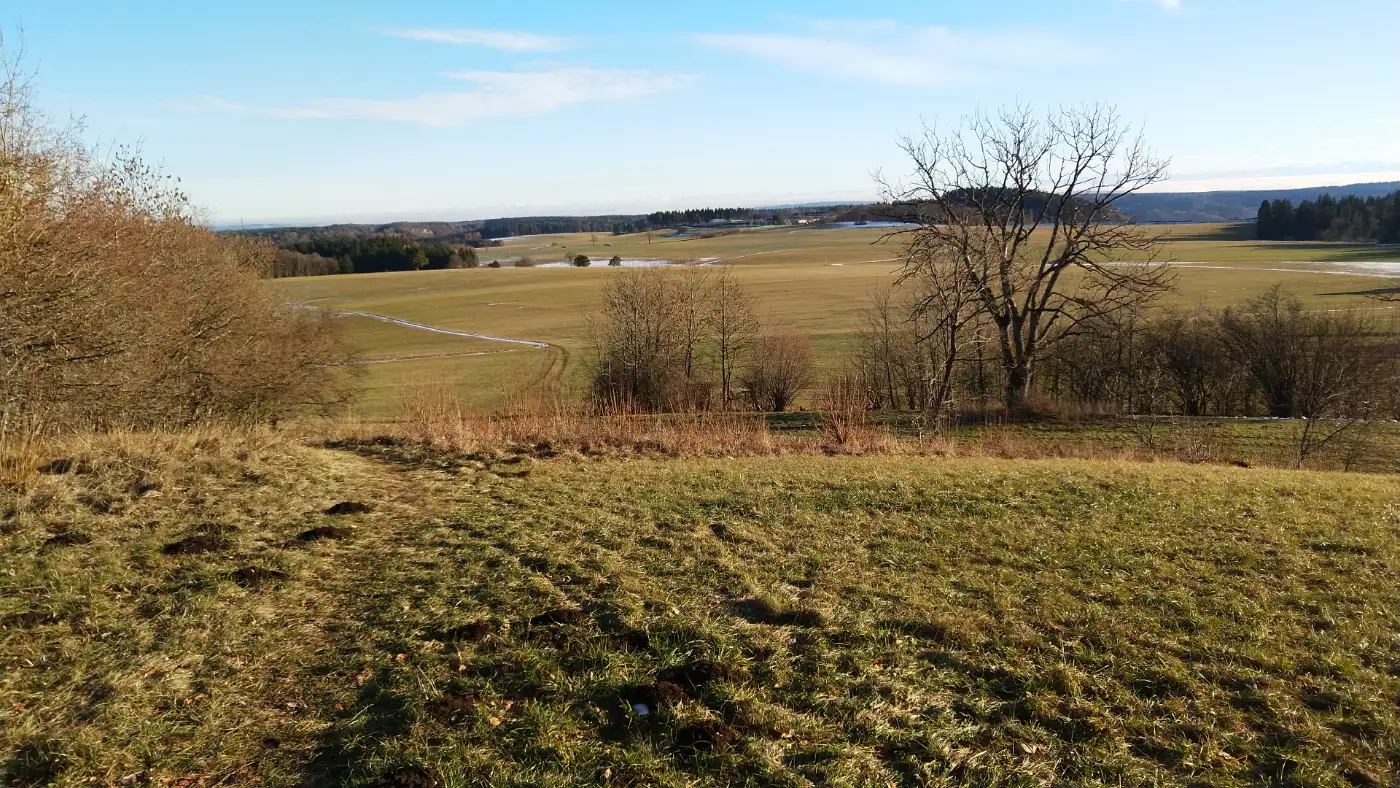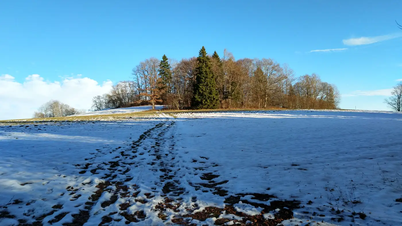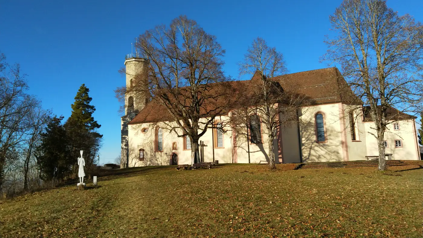 Wir folgen dem Höhenrücken weiter bergauf, bis die Dreifaltigkeitskirche vor uns auftaucht und den Gipfelbereich markiert. Vorbei an der Kirche erreichen wir einen der bekanntesten Aussichtspunkte der Region. Zwar bleiben die Alpen hier verborgen, doch breitet sich dafür die Baar weit unter uns aus, und der Schwarzwald bildet eine markante Kulisse am Horizont. Wir bewegen uns über offene Flächen, lassen die Weite auf uns wirken und genießen die besondere Stimmung dieses Ortes, der wie geschaffen ist für eine längere Pause, bevor wir unseren Weg fortsetzen.Der Hirnbühl