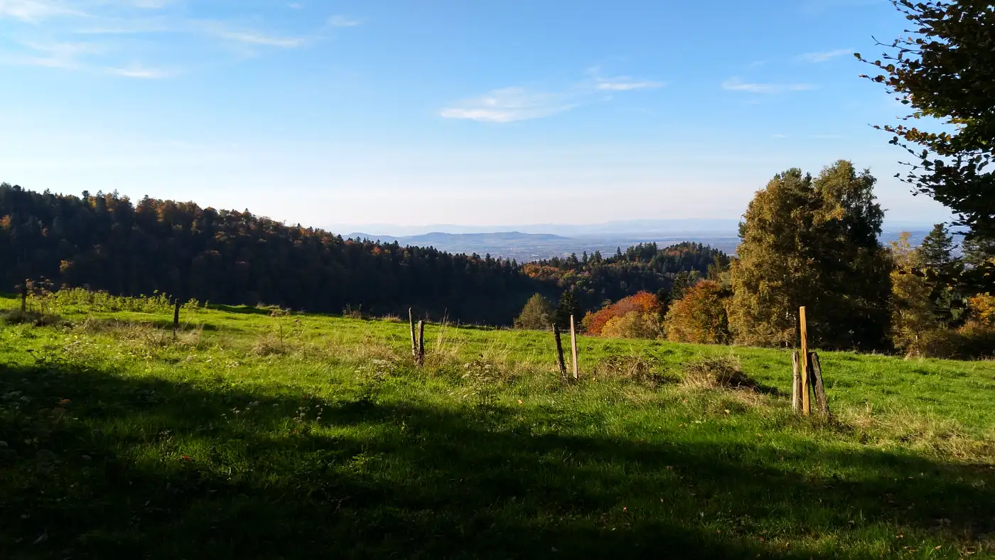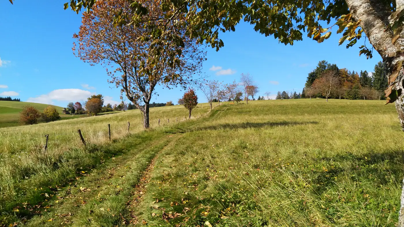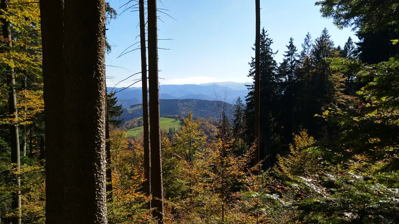 An der Nordseite der Klosterkirche St. Peter beginnen wir unseren Abstieg, passieren den stillen Friedhof und erreichen bald die Eschbachstraße, die wir vorsichtig überqueren. Ab hier folgen wir den Wegweisern mit der rot-weißen Raute, die uns zuverlässig in Richtung Freiburg führen. Schon nach wenigen Schritten stoßen wir auf den Kandelhöhenweg, der uns mit herrlichen Aussichten auf den Kandel begleitet. Der Weg verläuft auf einer abwechslungsreichen Mischung aus naturbelassenen Pfaden, Forstwegen und schmalen Höhenrouten. Mal wandern wir durch lichte Wälder, dann wieder über duftende Wiesen oder entlang eines schmalen Grats, der den Blick weit über die Schwarzwaldhöhen öffnet. Immer wieder laden kleine Lichtungen zum Verweilen ein. Die klare Markierung und die ruhige Umgebung machen diesen Abschnitt zu einer idealen Etappe, um Schritt für Schritt den Alltag hinter sich zu lassen und in die Stille der Natur einzutauchen.Aussichten vom Kandelhöhenweg