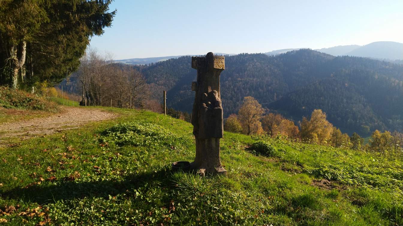 Wieder auf unserem Hauptweg geht es weiter bergauf, und wir nähern uns der Anhöhe des Hochgerichts (724 m). Hier stehen wir an einem Ort, der früher als Hinrichtungsstätte genutzt wurde. Heute zeugt lediglich ein einfacher Gedenkstein von der einstigen Bedeutung dieses Ortes. Wenige Schritte weiter weitet sich die Landschaft - das Plateau des Lindenbergs liegt vor uns, und hoch über den Schwarzwaldhöhen erhebt sich eindrucksvoll die Wallfahrtskirche Maria Lindenberg.Wallfahrtskirche Maria Lindenberg