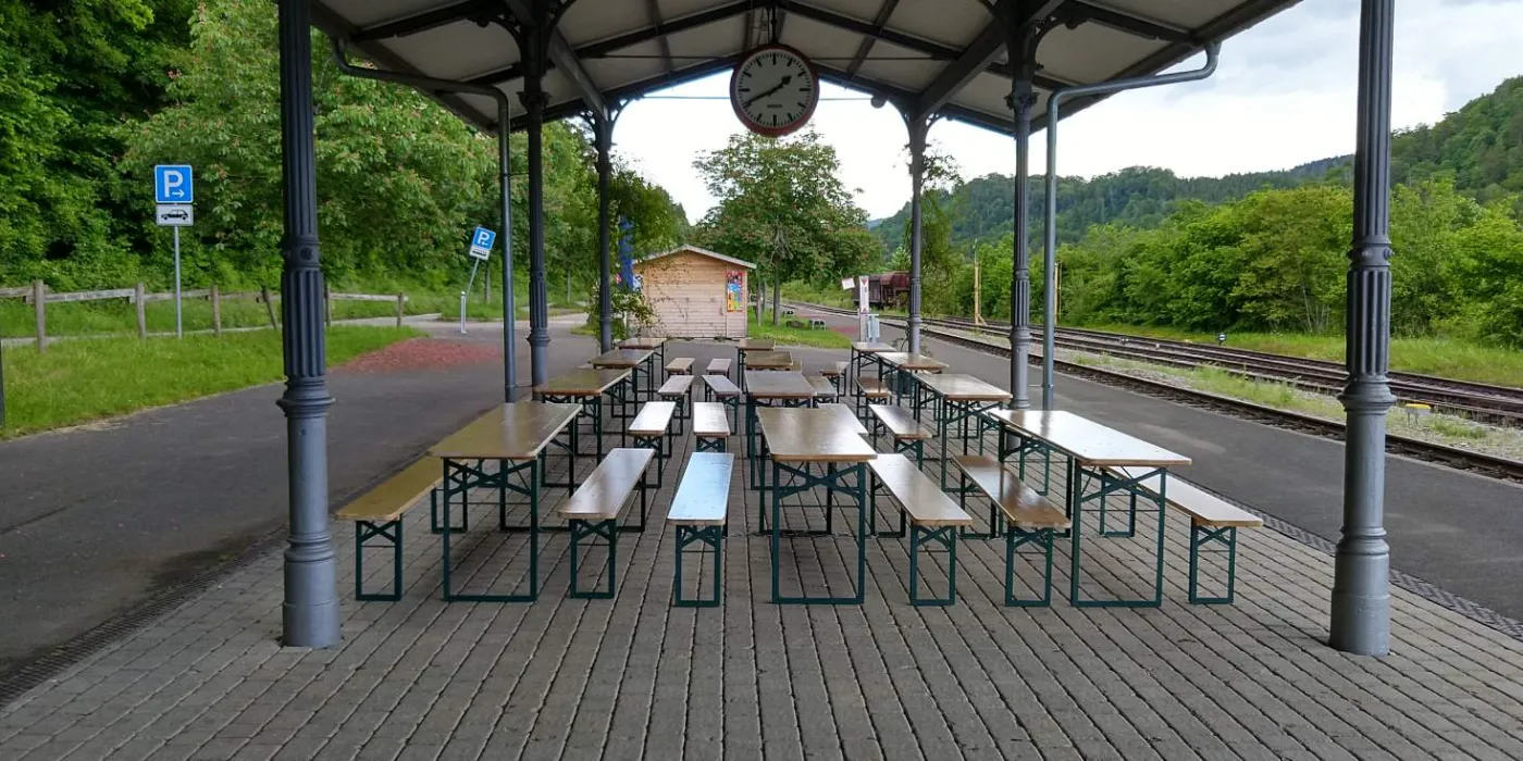 Die erste Etappe des Schluchtensteigs führt uns auf einer faszinierenden Route von Stühlingen nach Blumberg. Die erste Etappe des Schluchtensteigs verläuft auf einer eindrucksvollen Strecke von Stühlingen bis Blumberg. Dabei erwartet uns eine spannende Kombination aus faszinierender Natur, geschichtsträchtigen Orten und spektakulären Panoramablicken entlang der Sauschwänzlebahn - einer historischen Museumsbahn, die mit ihren markanten Viadukten und Tunneln beeindruckt. Startpunkt unserer Tour ist die katholische Kirche in Stühlingen, einem charmanten Städtchen mit liebevoll restaurierten Fachwerkhäusern. Zunächst führt uns der Weg durch den Ort, vorbei am Sportplatz, bis wir die Wutach erreichen. Wir folgen ihrem Verlauf auf naturnahen Pfaden, während sich der dichte Wald langsam um uns schließt.Bahnhof Weizen an der Museumsbahn
