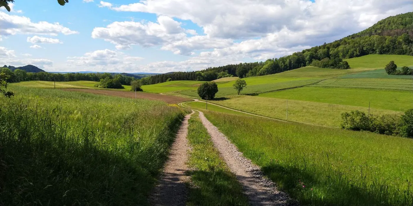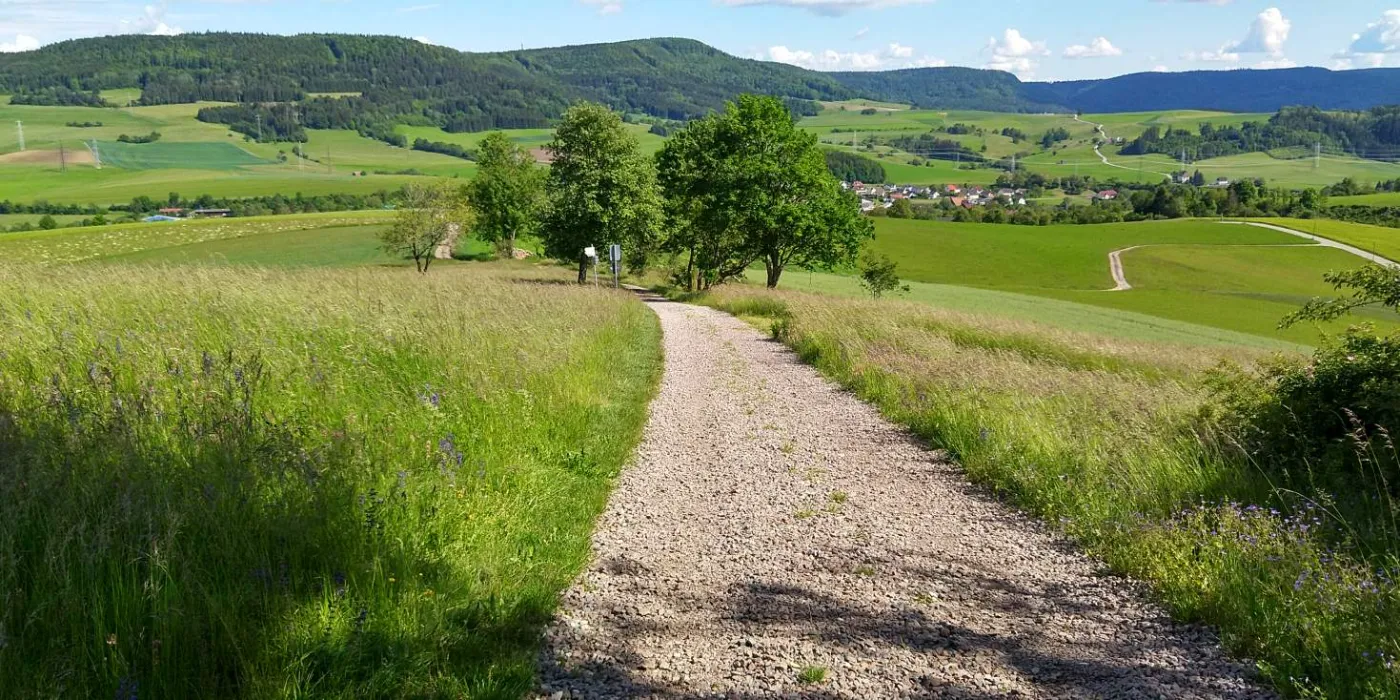 Nachdem wir die Wutachflühen durchquert haben, beginnt der Aufstieg über den Bühl und den Buchberg. Hier öffnet sich die Landschaft allmählich, und auf der Höhe angekommen, werden wir mit einem atemberaubenden Panoramablick belohnt. Bei guter Sicht reicht der Blick über das untere Wutachtal bis zu den Ausläufern des Schwarzwalds.Abstieg vom Buchberg