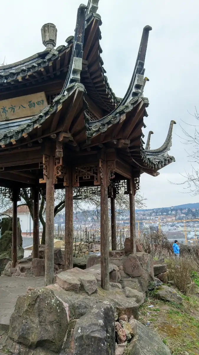 Nach wenigen weiteren Metern erreichen wir den Chinesischen Garten, auch als "Garten der schönen Melodie" bekannt. Diese kleine, aber beeindruckende Oase wurde 1993 als Zeichen der Freundschaft zwischen Stuttgart und seiner chinesischen Partnerstadt Nanjing angelegt. Der Garten spiegelt traditionelle chinesische Landschaftsgestaltung wider, mit geschwungenen Wegen, einem Teich mit Koi-Karpfen und der kunstvoll gestalteten Pagode. Besonders schön ist die Aussicht auf Stuttgart, die durch gezielt platzierte Öffnungen in den Wänden eingerahmt wird. Nach einer kurzen Verschnaufpause setzen wir unsere Wanderung fort.Kriegsbergturm