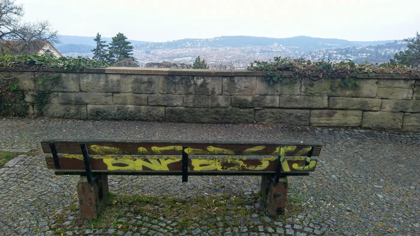 Wir folgen der Birkenwaldstraße bergauf und erreichen an der Bushaltestelle Kaisermer einen schmalen Wiesenpfad namens Hexenwäldle, der uns weiter nach oben führt. Dieser malerische Weg bringt uns direkt zum Kriegsbergturm, einem 1895 errichteten Aussichtsturm aus Sandstein, der sich inmitten eines kleinen Parks befindet. Der Turm ist 23 Meter hoch und bietet eine beeindruckende Rundumsicht über Stuttgart bis hin zum Schwarzwald und zur Schwäbischen Alb. Wer die 92 Stufen hinaufsteigt, wird mit einem unvergleichlichen Blick über die Dächer der Stadt belohnt.Aussichtspunkt Schottstraße