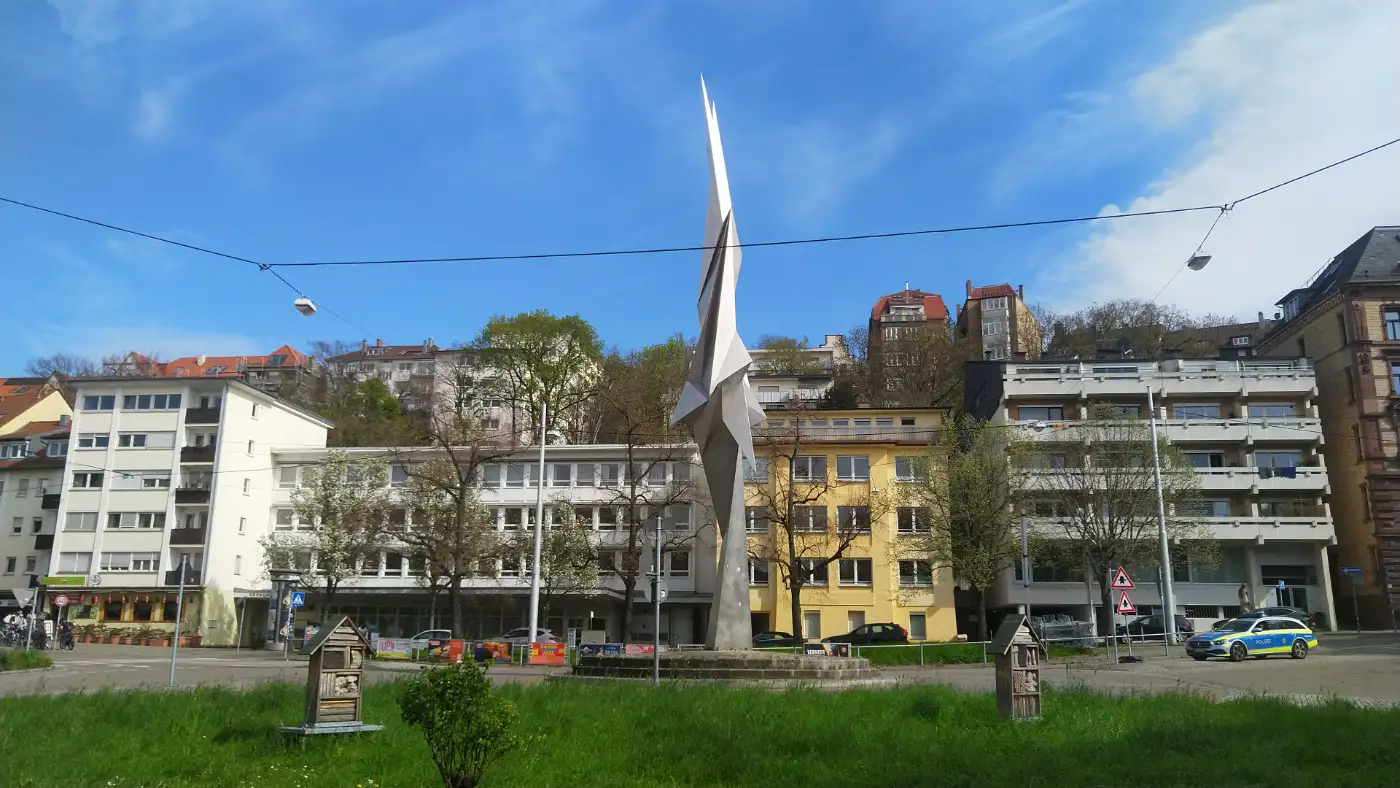 Wir folgen dem Weg weiter durch die Parkanlage, die von alten Bäumen, Teichen und gepflegten Wiesen geprägt ist, und gelangen schließlich zum Wullesteg. Über diesen modernen Fußgängersteg überqueren wir die verkehrsreiche Willy-Brandt-Straße, die das Stadtzentrum vom Osten trennt. Auf der anderen Seite führt uns der Weg am markanten Hotel Le Méridien vorbei. Direkt dahinter beginnt die Wullestaffel, eine beeindruckende historische Treppenanlage, die steil hinauf zum Kernerplatz führt. Von hier aus haben wir bereits einen schönen Blick auf Teile der Innenstadt und beginnen langsam, den geschäftigen Trubel hinter uns zu lassen.Aussichtspunkt Uhlandshöhe