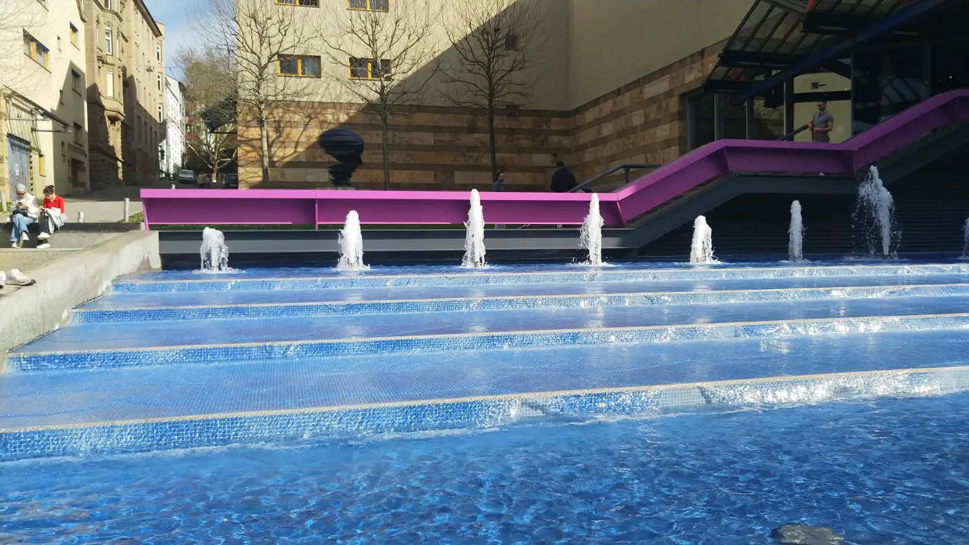Die rauschende Wasserstaffel vor der Staatsgalerie Suttgart, im Hintergrund die Skulptur Point ov View des Bildhauers Tony Cragg.