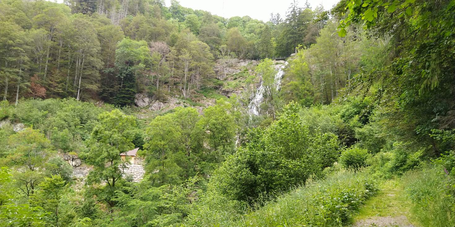 Von hier aus führt die Wanderung weiter rechts unterhalb der Hängebrücke bergauf. Statt die Brücke zu überqueren, halten wir uns auf dem gut erkennbaren Pfad, der sich in Serpentinen weiter nach oben schlängelt.Schwimmbad Todtnauberg