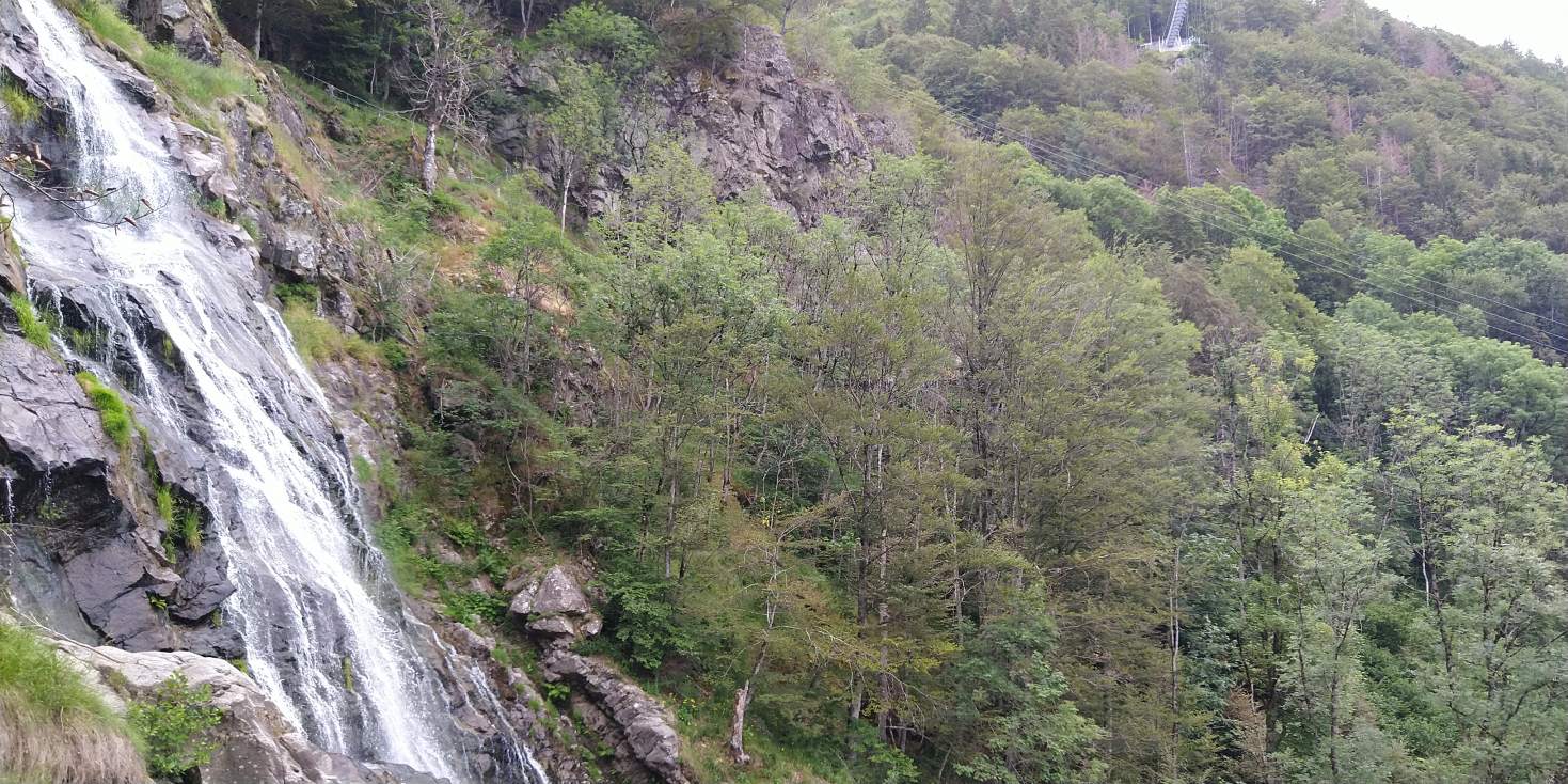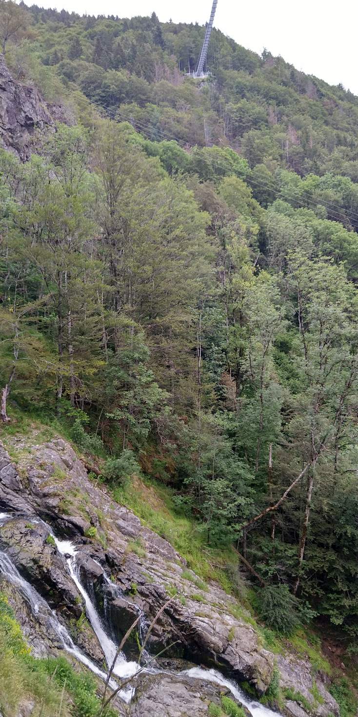 Nach etwa 30 Minuten erreichen wir den Todtnauer Wasserfall (795 m), einen der höchsten Naturwasserfälle Deutschlands. Das Wasser stürzt hier in fünf Kaskaden 97 Meter in die Tiefe - ein beeindruckendes Naturschauspiel! 👉 Tipp: Nehmen wir uns Zeit für eine Pause und genießen die erfrischende Gischt, die sich in der Luft verteilt. Eine hölzerne Aussichtsplattform bietet einen perfekten Blick auf die fallenden Wassermassen.Unterhalb der Hängebrücke