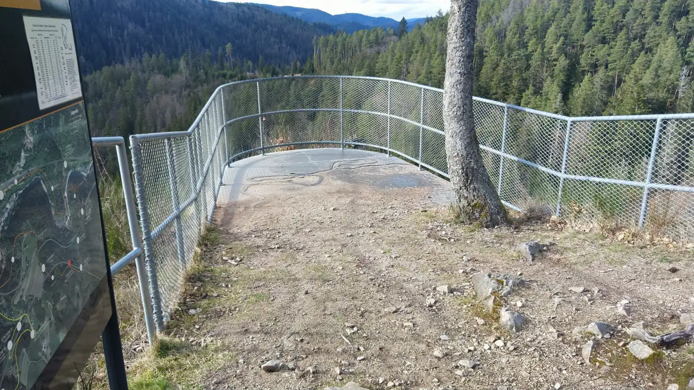 An der Station 11 gibt es eine Plattform, von der aus man tief hinunter auf die Gleise blicken kann - ein beeindruckender Anblick, besonders wenn gerade ein Zug durch die engen Kurven fährt. Wir folgen dem Hubertusweg weiter in Richtung Hohnen-Aussichtspunkt, da wir sonst denselben Weg zurückgehen müssten. Von hier aus eröffnet sich eine weite Aussicht über das Tal und die dichten Wälder des Schwarzwaldes. Nach einem kurzen Abstieg erreichen wir den Wegweiser Dreibahnenblick, der uns den Weg zur wohl spektakulärsten Aussicht des gesamten Erlebnispfades weist.Aussichtsplattform Dreibahnenblick