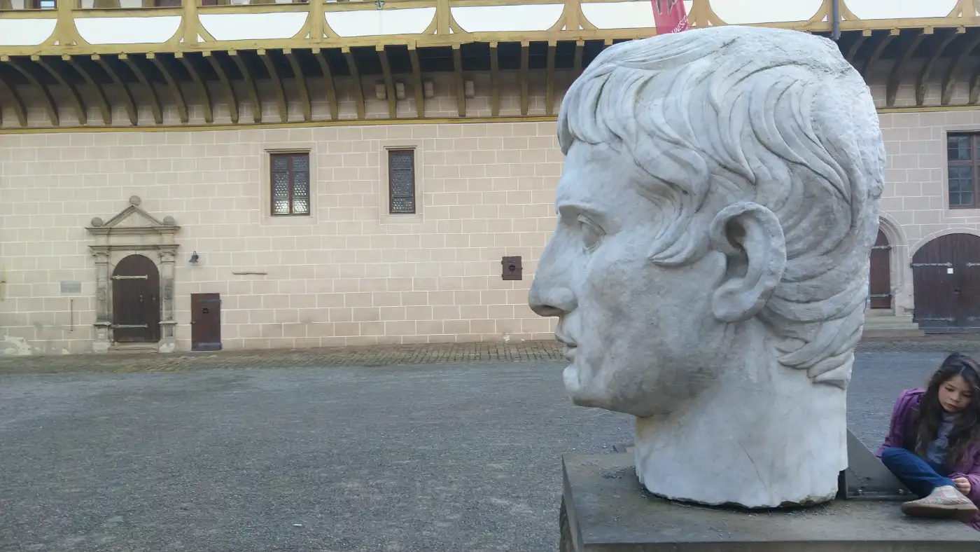 Der Anstieg endet am Schloss Hohentübingen, das hoch über der Stadt thront und auf einem steilen Bergsporn an der Spitze des Schlossbergs liegt. Die Anlage geht auf eine mittelalterliche Burg zurück, die im 16. Jahrhundert zu einem repräsentativen Renaissancebau ausgebaut wurde. Heute gehört das Schloss zur Universität Tübingen und beherbergt mehrere bedeutende Sammlungen - unter anderem archäologische, ethnologische und kulturhistorische Exponate, die weit in die Menschheitsgeschichte zurückreichen. Dadurch verbindet der Ort Geschichte, Wissenschaft und Landschaft auf besondere Weise. Wir betreten den Innenhof und genießen den weiten Blick über die Dächer Tübingens und das Neckartal, bevor wir uns wieder auf den Weg machen.Bronzeskulptur eines Wildpferds