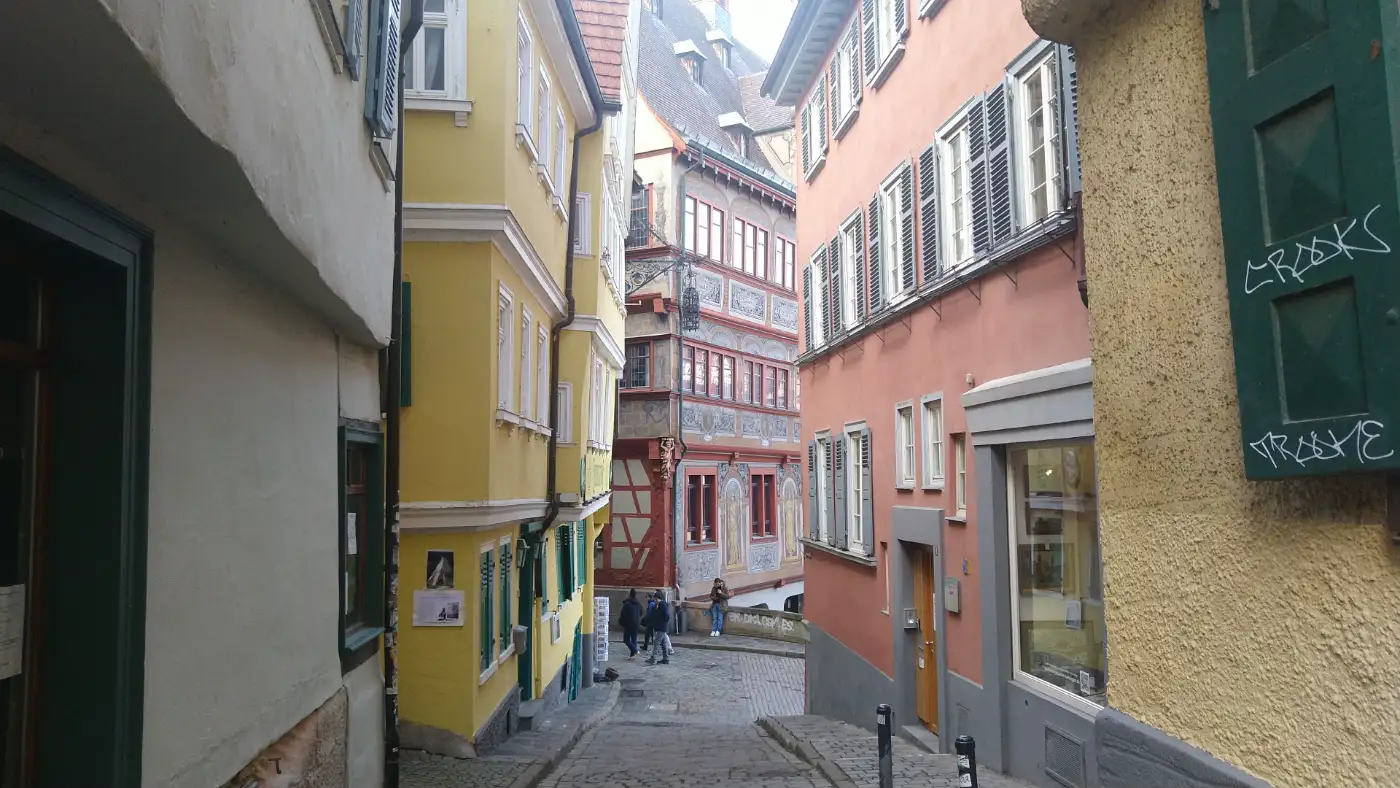 Im Umfeld des Schlosses stoßen wir auf die Bronzeskulptur eines steinzeitlichen Wildpferds - eine künstlerische Hommage an eines der ältesten Zeugnisse menschlicher Kreativität. Das Original einer solchen Figur, das sogenannte "Vogelherdpferdchen", wurde 1931 in der Vogelherdhöhle im Lonetal gefunden und gehört zu den frühesten bekannten Kunstwerken der Menschheit. Diese Miniatur aus Mammutelfenbein ist rund 40 000 Jahre alt und zählt zu den herausragenden Exponaten der Sammlung "Alte Kulturen" im Museum der Universität Tübingen auf Schloss Hohentübingen.Historische Altstadt von Tübingen