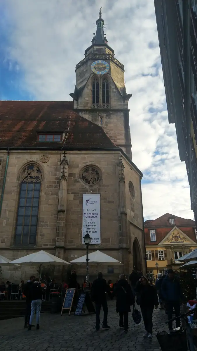 Vom Schloss aus führt uns der Weg hinab in die historische Altstadt. Wir schlendern durch enge Gassen, vorbei am Marktplatz und dem historischen Rathaus in Richtung Holzmarkt. Viele der Fachwerkhäuser stammen aus dem 15. und 16. Jahrhundert und prägen bis heute das geschlossene mittelalterliche Stadtbild. Das lebendige Treiben steht im spannenden Gegensatz zu den ruhigen Abschnitten zuvor. Cafés, Läden und Straßenszenen verleihen diesem Teil der Wanderung eine besondere Dynamik und zeigen Tübingen von seiner lebhaften Seite.Stiftskirche St. Georg in Tübingen
