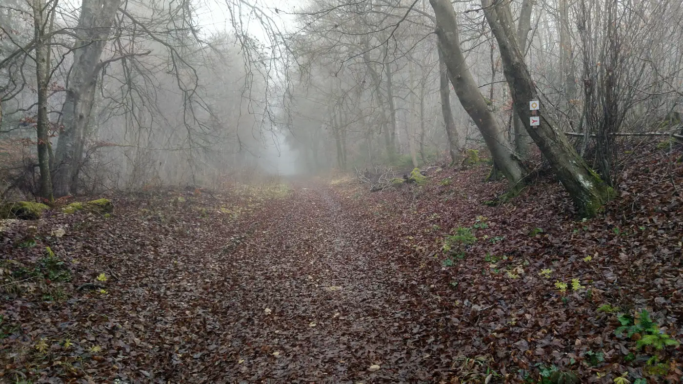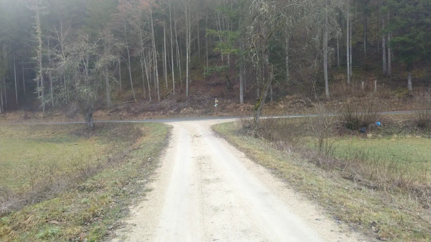 Hinter der Burganlage folgen wir dem lichten Bergrücken weiter in Richtung des Stadtteils Lohmehlen. Dort passieren wir links die Bäckerei Schneckenburger und wandern auf dieser Straße die weitläufige Kurve hinauf in Richtung Wald. Am Wegweiser Neuhausen ob Eck erreichen wir schließlich den Waldweg. Der Forstweg mit dem Namen Mattensteige führt nun gleichmäßig ansteigend durch den Wald, begleitet vom Rascheln der Blätter und dem leisen Knacken der Äste unter unseren Schritten. Dieser Abschnitt bildet einen ruhigen Übergang von der historischen Kulisse in die stille Natur.Rotmäntlergrab