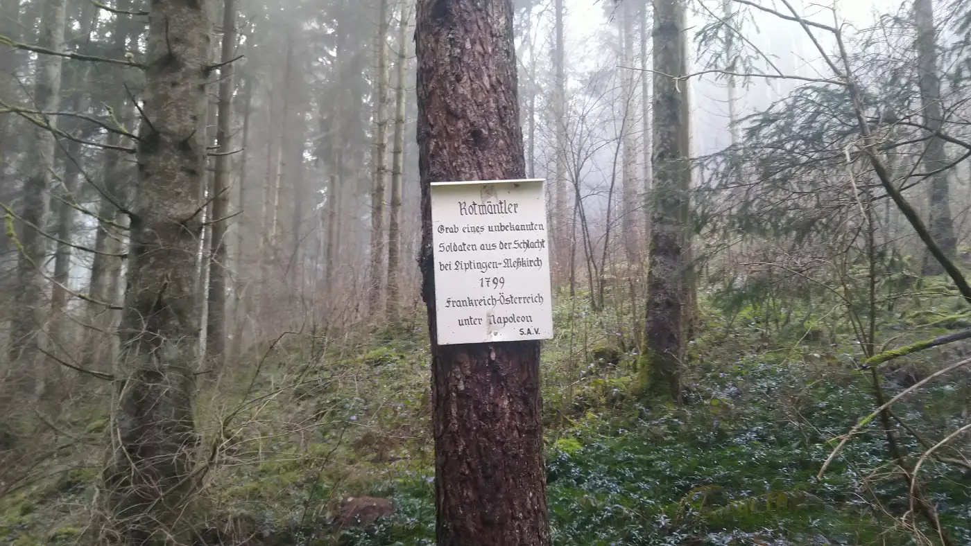 Mitten im Wald erreichen wir das sagenumwobene Rotmäntlergrab, eine kleine, aber historisch interessante Stelle im Waldgebiet nahe Sengenbühl. Der unscheinbare Ort markiert nach Überlieferung den Fundpunkt eines Soldatengrabes aus den Zeiten der Koalitionskriege Ende des 18. Jahrhunderts: Man nimmt an, dass hier ein verwundeter Angehöriger der österreichischen Armee, der wegen seines charakteristischen roten Mantels "Rotmäntler" genannt wurde, seinen Verletzungen erlegen ist und beigelegt wurde. Die Bezeichnung des Grabes leitet sich direkt von dieser historischen Kleidung ab.Sengenbühlbuche