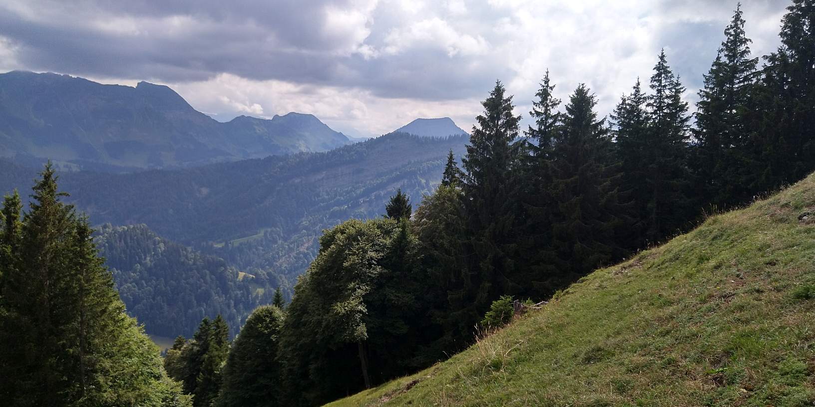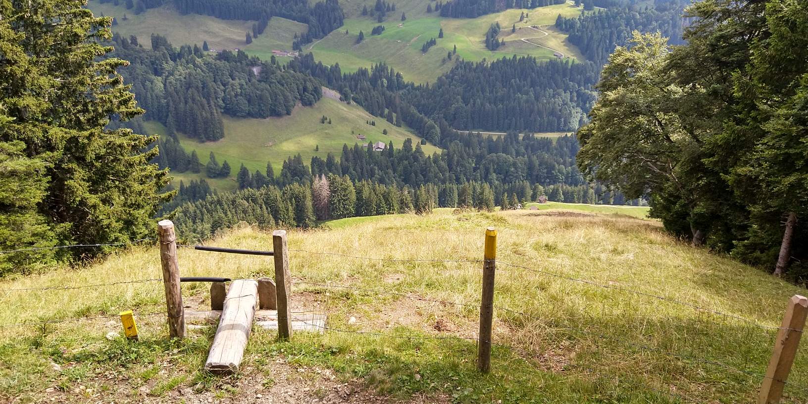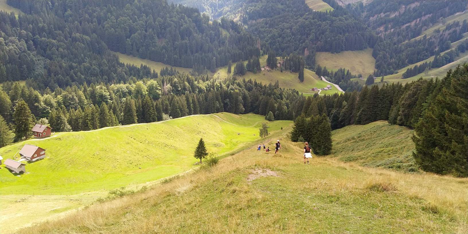 Nach rund 2,5 Stunden Aufstieg erreichen wir den Gipfel des Spitzli. Die Anstrengung wird mit einem grandiosen Rundblick belohnt: Das gesamte Appenzellerland breitet sich vor uns aus, mit sanften Hügelketten, tiefen Tälern und einer faszinierenden Alpenkulisse im Hintergrund.Abstieg, der in die Beine geht