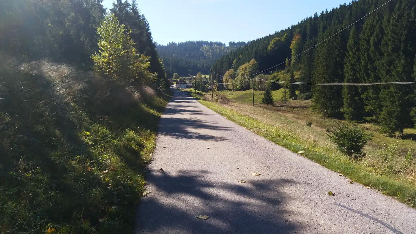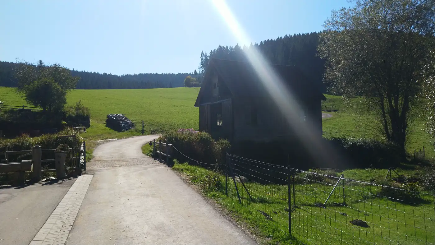 Nach unserer Pause setzen wir den Weg in Richtung Linach fort. Zunächst führt uns der Pfad durch den Wald, stetig bergab ins Linachtal. Dort entdecken wir die Wendelinkapelle, deren Holzschindeln von dunkelbraun bis grauschwarz reichen. Mit ihrem schlichten Schieferdach und dem kleinen, blechumrahmten Kirchturm wirkt sie beinahe wie aus einer anderen Zeit. Wir treten näher, lassen den Blick über die Umgebung schweifen und nehmen die besondere Stimmung dieses Ortes auf. Linach selbst schmiegt sich idyllisch ins Tal und vermittelt die typische Gelassenheit des Schwarzwalds.Weg von Linach hinauf nach Urach