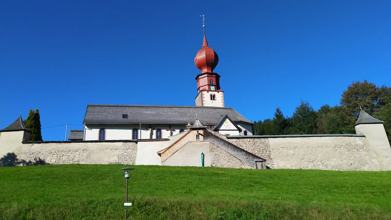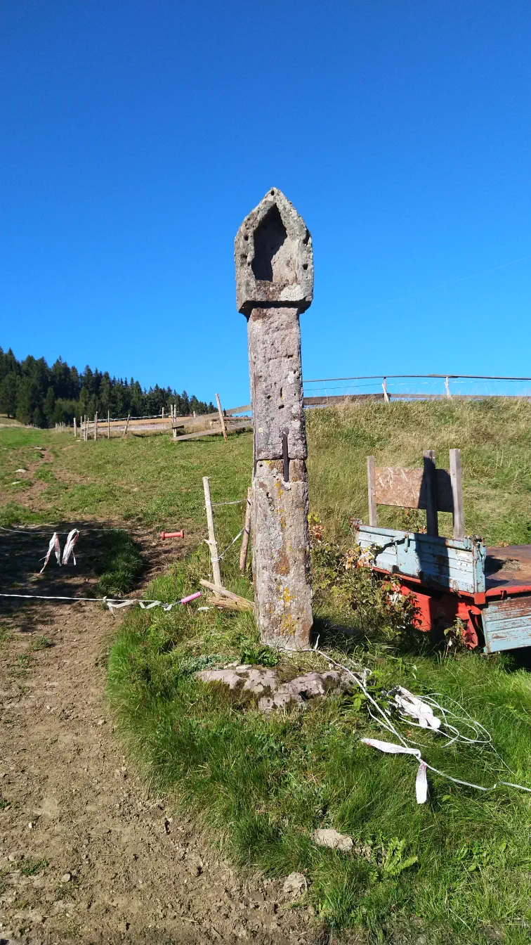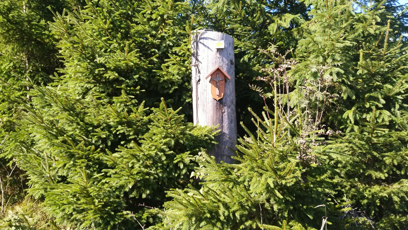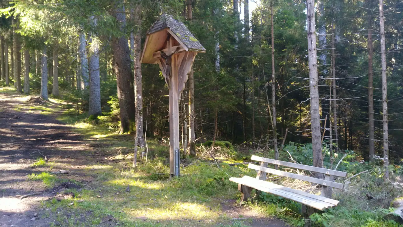 Nachdem wir den ersten längeren Aufstieg hinauf zum Kesselberg hinter uns gebracht haben, erreichen wir bald ein Wegkreuz, das zugleich als Jahrgangskreuz von 1931/1932 bekannt ist. Wir verweilen einen Moment, betrachten die eingravierten Jahreszahlen und denken an die Menschen jener Zeit. Zwei Bänke laden hier zum Ausruhen ein, und wir nutzen die Gelegenheit für unsere erste Pause - umgeben von völliger Einsamkeit, Stille und abgeschiedener Natur.Linach und die Wendelinkapelle