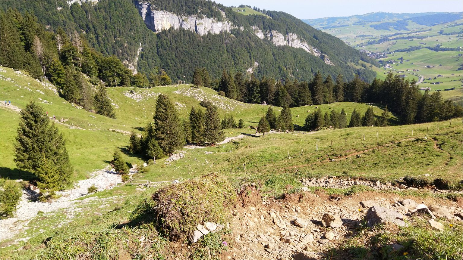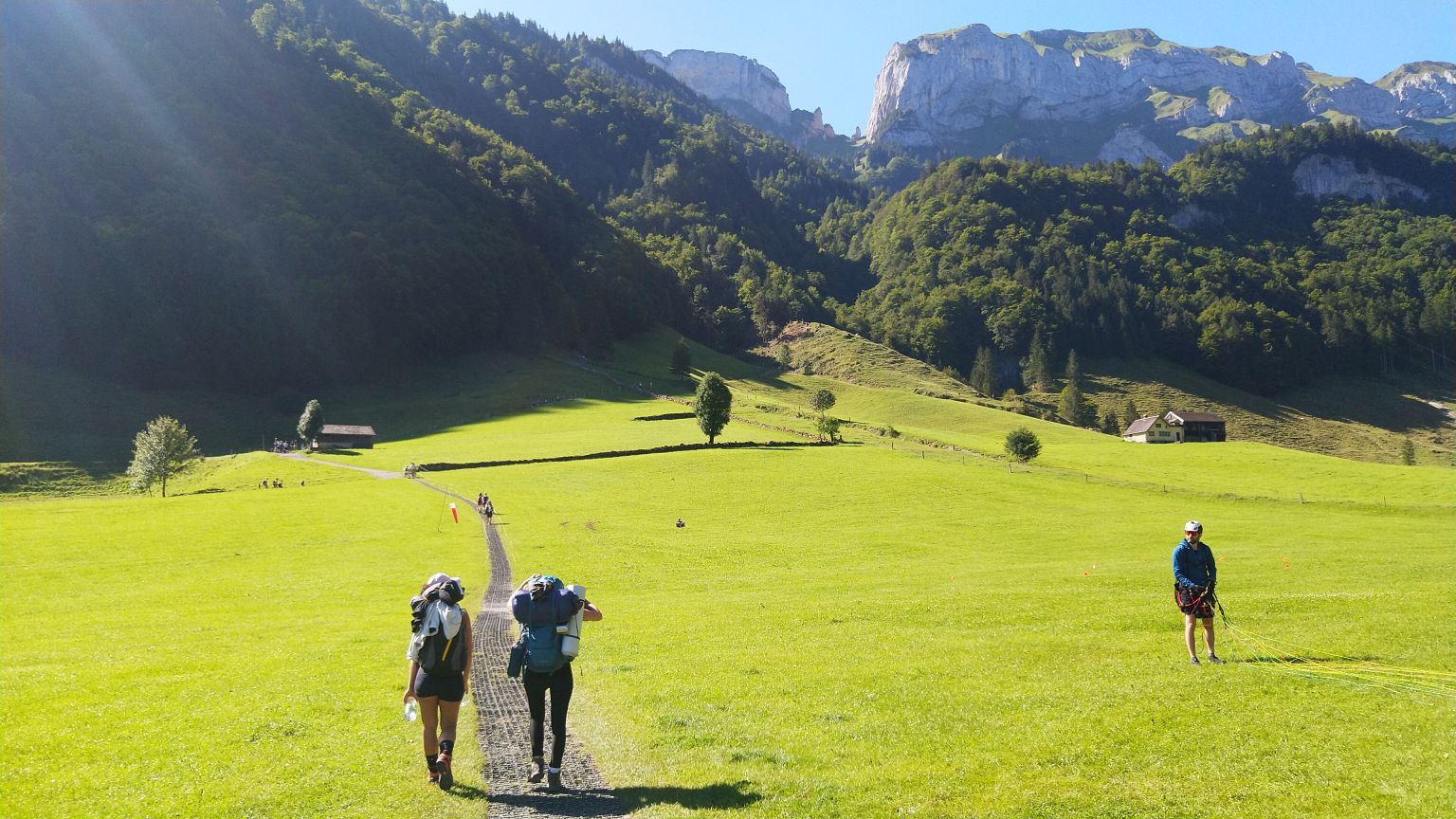 Nach dem Gipfel führt der Weg über einen steilen Abstieg hinab zum Widderalpsattel. Hier weitet sich das Gelände wieder, und der Weg wird entspannter. Bald erreichen wir die Meglisalp - eine malerisch gelegene Alpkolonie mit einem Gasthaus, Kapelle und Kuhglockenmusik. Eine ideale Gelegenheit für eine Pause, eine kühle Erfrischung oder eine traditionelle Appenzeller Mahlzeit.
