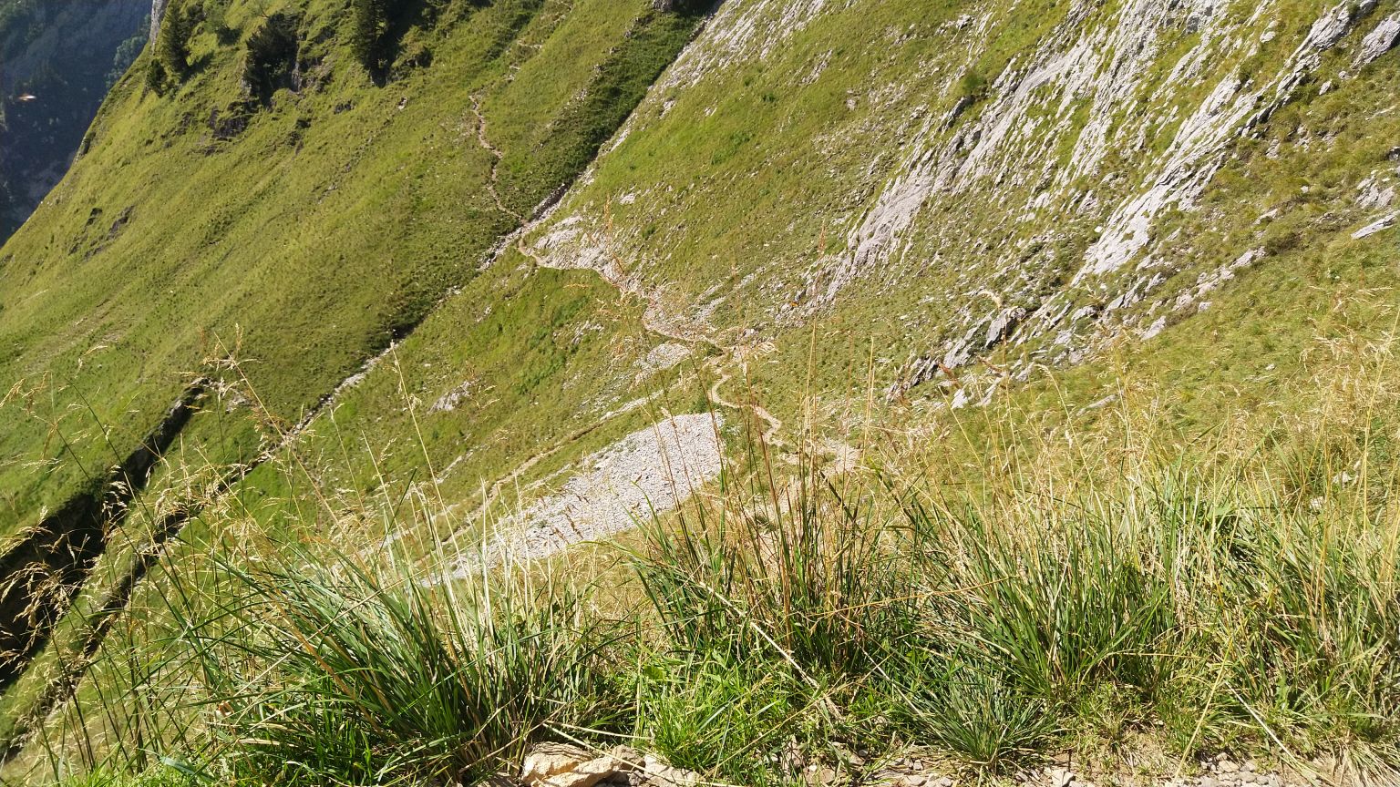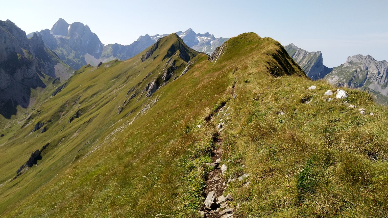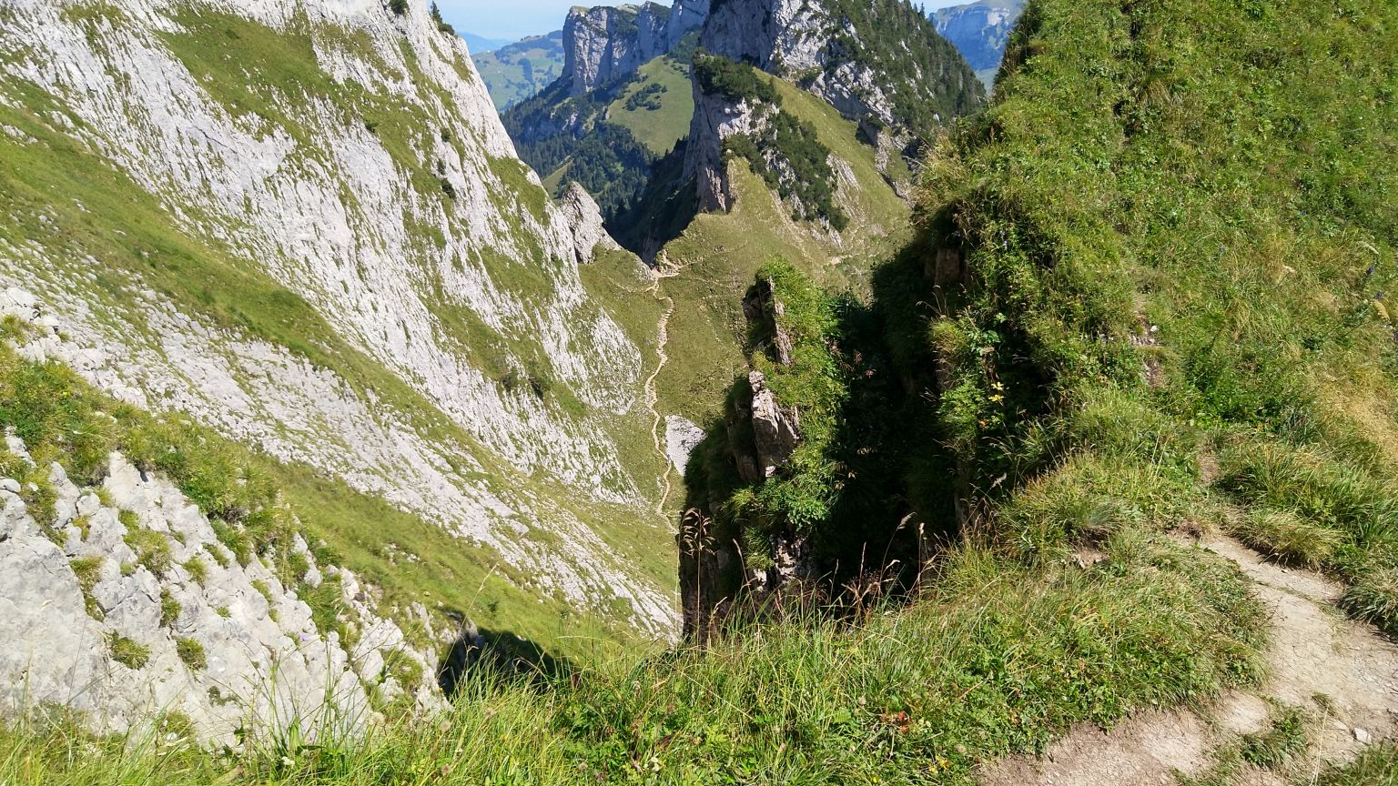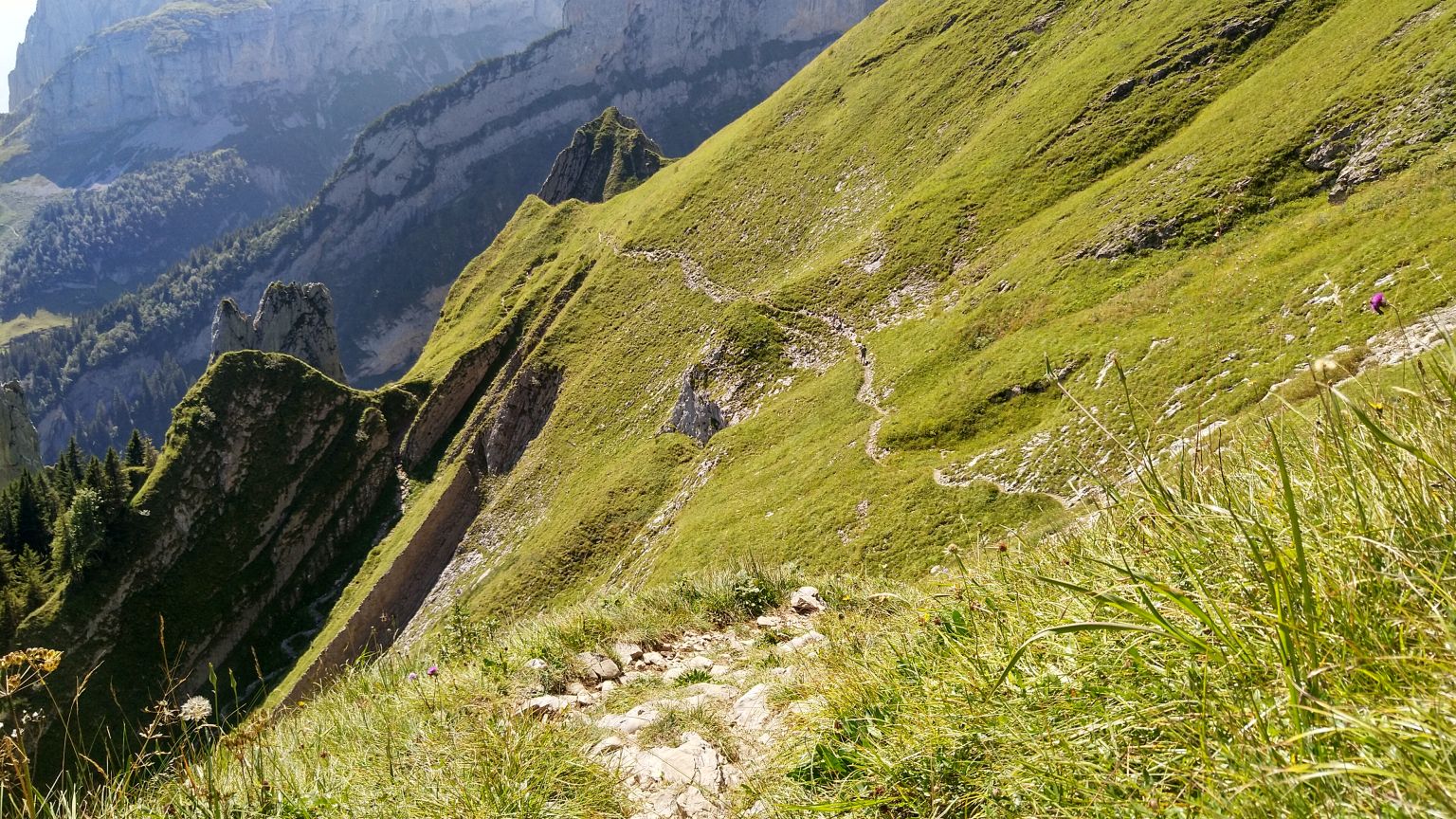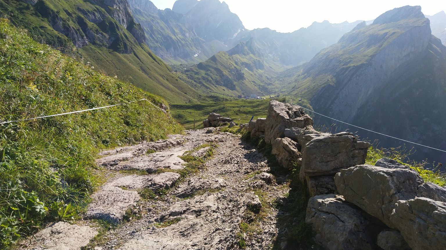 Direkt vom Bahnhof Wasserauen aus führt der Weg durch saftig-grüne Alpwiesen hinauf in Richtung Bogartenlücke. Der stetig steile Aufstieg ist schweißtreibend, aber landschaftlich reizvoll - immer begleitet vom Blick auf den Säntis, Ebenalp und die senkrechten Kalkwände des Alpsteins. Ab etwa 1300 m verändert sich das Gelände zunehmend: Wiesenpfade weichen felsdurchsetzten Steigen. Die Bogartenlücke ist eine markante Senke im Gratverlauf - hier beginnt das alpine Abenteuer.Schlüsselstelle: Trittsicherheit erforderlich