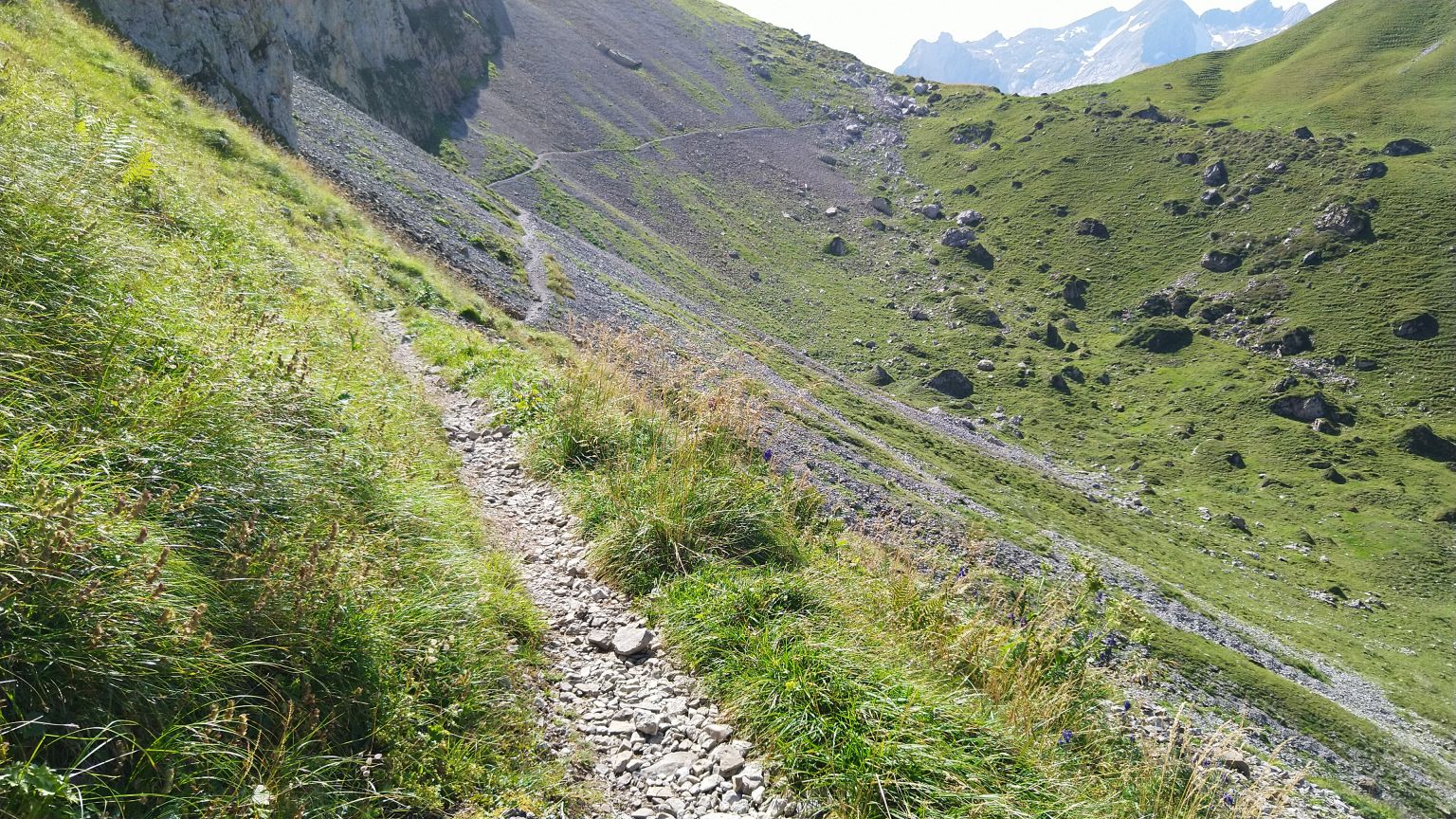Ab der Lücke wechselt die Markierung auf blau-weiß-blau, was in der Schweiz für alpine Routen steht. Der Weg steigt zunächst steil an über Schrofengelände und Geröll. Schon bald erreichen wir die erste Schlüsselstelle - eine exponierte Hangquerung mit abschüssigem Gelände und ausgesetzten Passagen. Hier ist absolute Trittsicherheit, Schwindelfreiheit und Konzentration gefragt. Bei Nässe ist dieser Abschnitt unbedingt zu meiden.Ostgipfel der Marwees