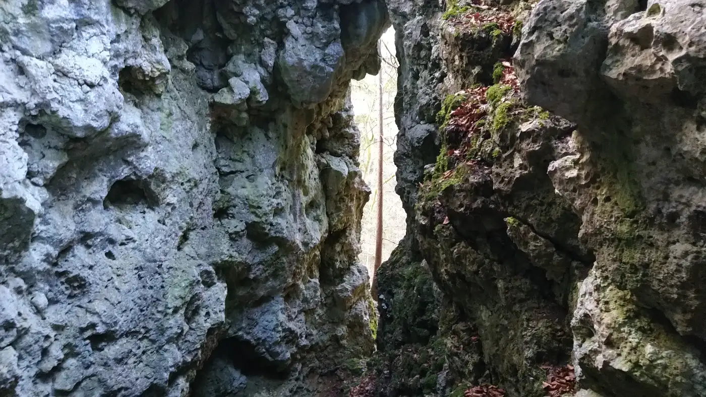 Hinter Bubsheim wird der Weg abwechslungsreicher, und wir steuern auf die Burgruine Granegg zu. Der Pfad führt leicht ansteigend durch Wald und über schmale Wege, bis die ersten Mauerreste zwischen den Bäumen auftauchen. An der Ruine angekommen, erkunden wir die verbliebenen Strukturen und stellen uns vor, wie die Burg einst über die Umgebung wachte. Die Lage auf dem Felssporn vermittelt auch heute noch ein Gefühl von Abgeschiedenheit und Geschichte.Felsentor an der Ruine Granegg