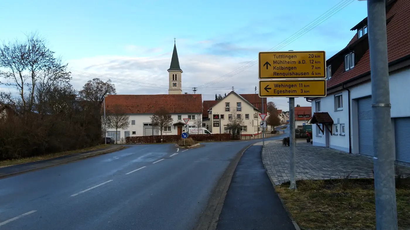Zum Abschluss unserer Wanderung erreichen wir Königsheim, das wir über sanft abfallende Wege ansteuern. Der Ort empfängt uns mit einer ruhigen, fast ländlichen Atmosphäre und bildet einen stimmigen Endpunkt der Tour. Wir lassen die zurückgelegte Strecke Revue passieren und genießen das Gefühl, eine abwechslungsreiche Wanderung zwischen Albhochfläche, Wald und markanten Natur- und Kulturpunkten erlebt zu haben.Diese Tour wurde am 17.12.2025 von einer realen Person erwandert, fotografiert und beschrieben. Die GPS-Daten der Fotos wurden vor Ort erfasst und dienten zur exakten Rekonstruktion der Route.