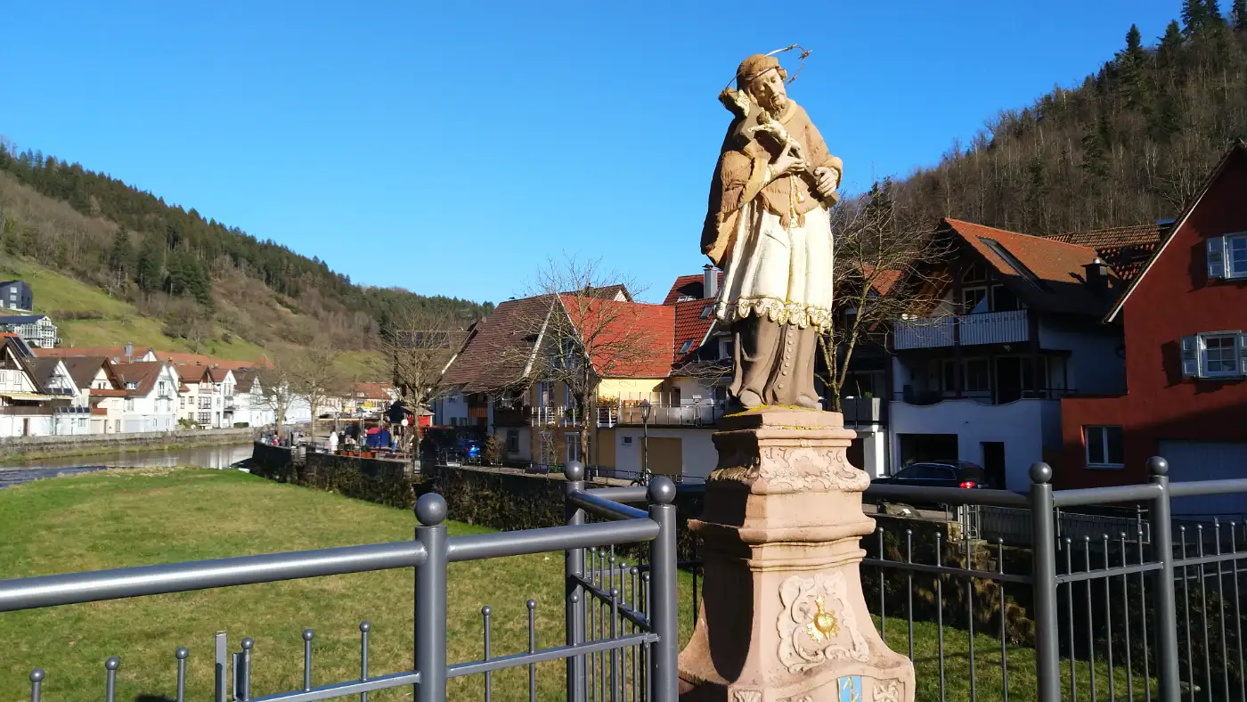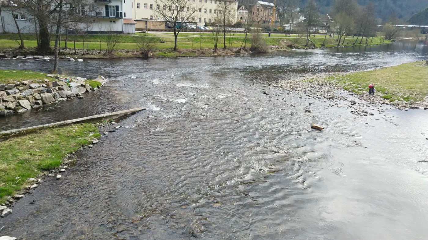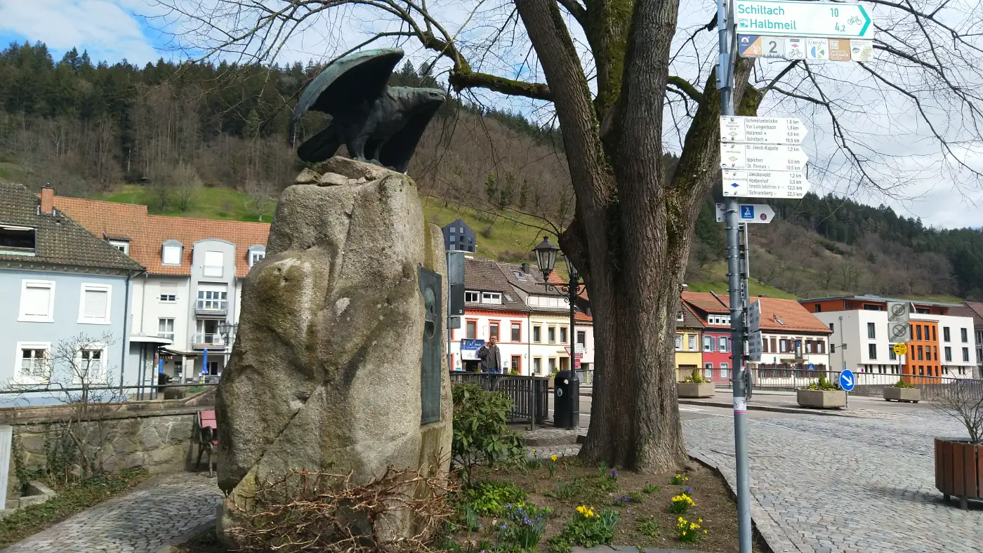 Unsere Wanderung beginnt am Bahnhof von Wolfach, einem charmanten Ausgangspunkt für unsere Tour. Wir verlassen den Bahnhof auf der rechten Seite und begeben uns zunächst in Richtung historische Innenstadt. Schon nach wenigen Gehminuten rückt das imposante Fürstenbergische Schloss ins Blickfeld, dessen beeindruckende gelbliche Fassade und markante Türme ein Wahrzeichen der Stadt sind. Durch den alten Torbogen des Schlosses treten wir in das Herz von Wolfach, eine Stadt, die reich an Geschichte und Tradition ist. Entlang der malerischen Hauptstraße spazieren wir vorbei an hübsch restaurierten Fachwerkhäusern, kleinen Geschäften und gemütlichen Cafés, bis wir schließlich das Adlerdenkmal erreichen.Zusammenfluß: Kinzig und Wolf