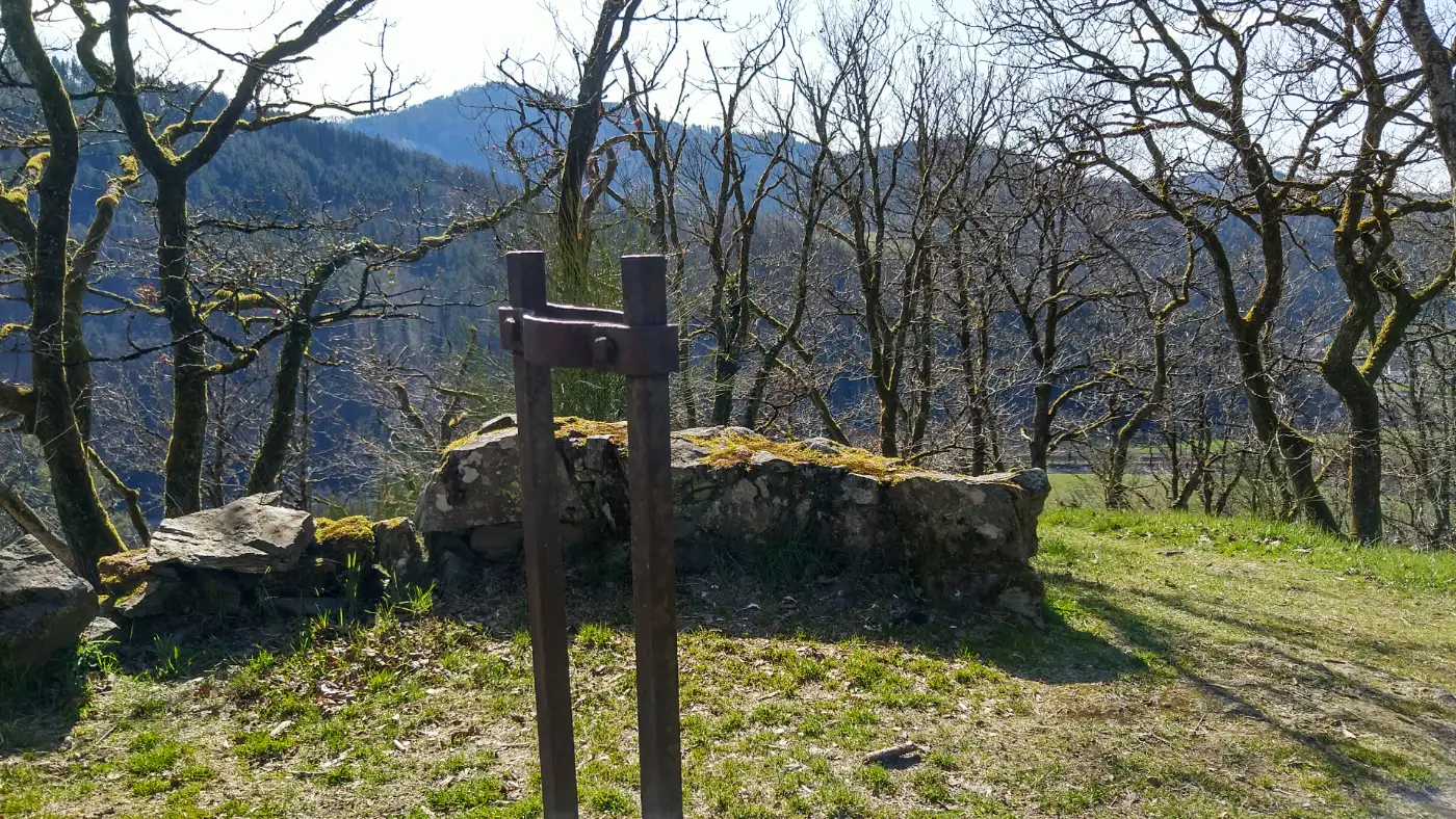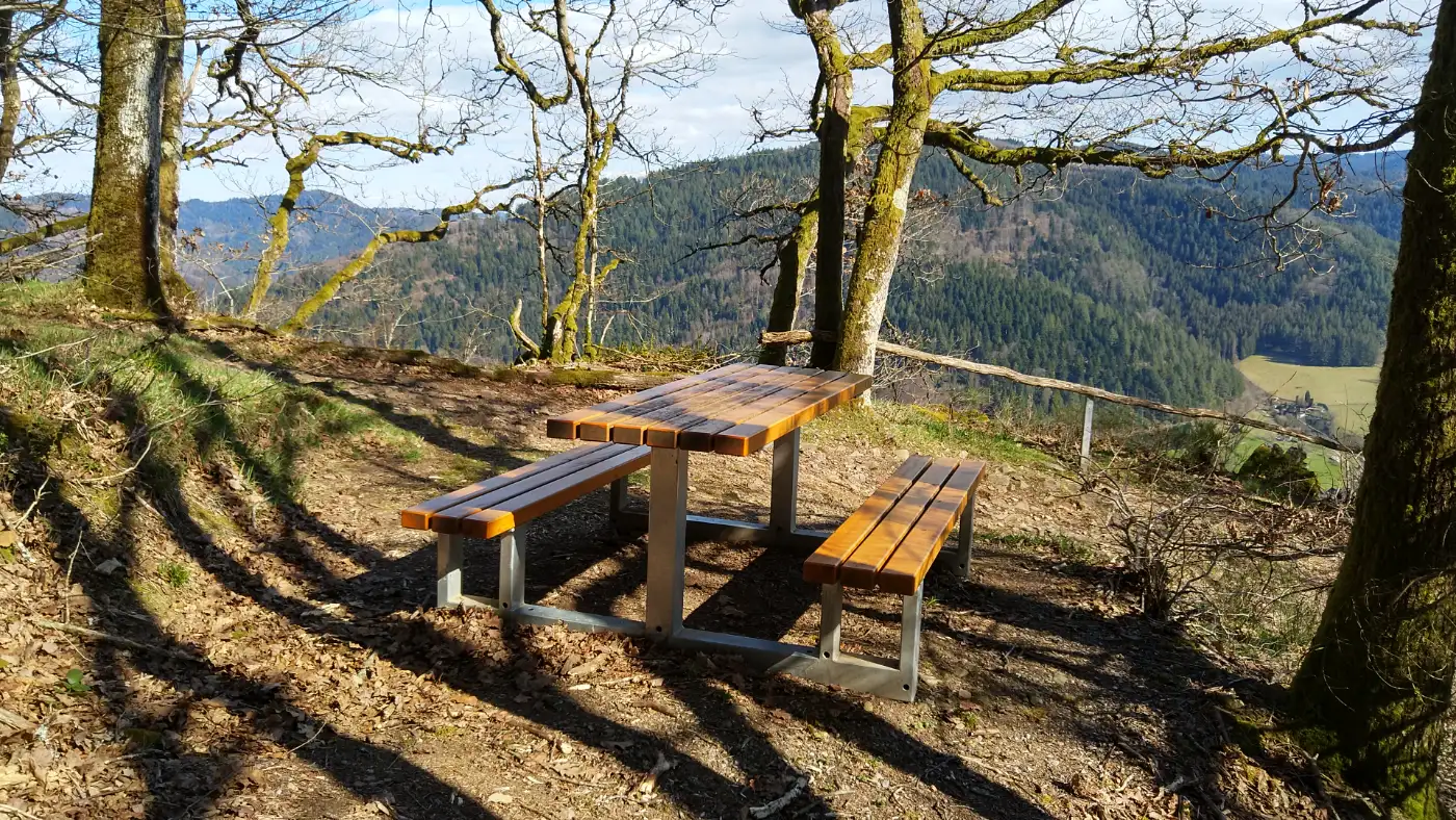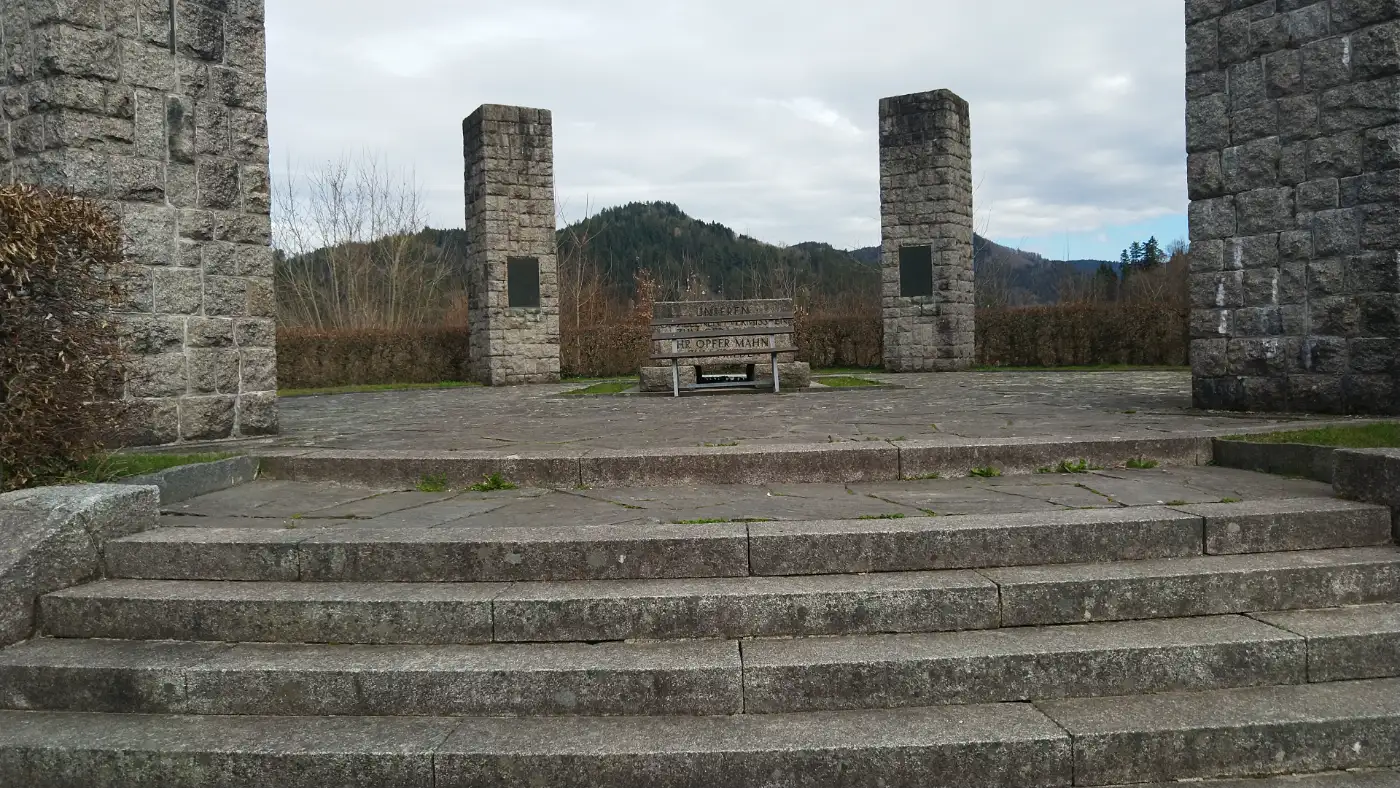 Wir folgen zunächst weiter dem Kinzigufer, bis wir eine Schule erreichen, die sich rechterhand befindet. An dieser Stelle zweigt unser Weg steigend nach rechts ab - der Anstieg beginnt. Von hier an beginnt der Weg, sich allmählich in die stillen, waldreichen Höhen des Schwarzwalds zu schlängeln. Der Grenzgänger Steig führt uns über wurzelgesäumte Pfade und sanfte Anstiege, während sich nach und nach weite Ausblicke über die Baumkronen eröffnen. Als erstes bedeutendes Etappenziel unserer Wanderung erreichen wir das Wolfacher Mahnmal, einen eindrucksvollen Steinkreis, der als stilles Gedenken an die im Zweiten Weltkrieg gefallenen Soldaten der Stadt errichtet wurde. Die Anlage besteht aus sechs massiven quaderförmigen Säulen, die in einem Kreis angeordnet sind, während in ihrer Mitte ein großer steinener Altarblock ruht. Jede dieser Säulen trägt die Namen der insgesamt 84 Männer aus Wolfach, die im Krieg ihr Leben verloren. Die Inschriften sind tief in Metalltafeln eingraviert - ein stilles, aber kraftvolles Symbol für die Tragik des Krieges und die Erinnerung an die Opfer.Ort der Erinnerung - inspiriert von alten Steinkreisen