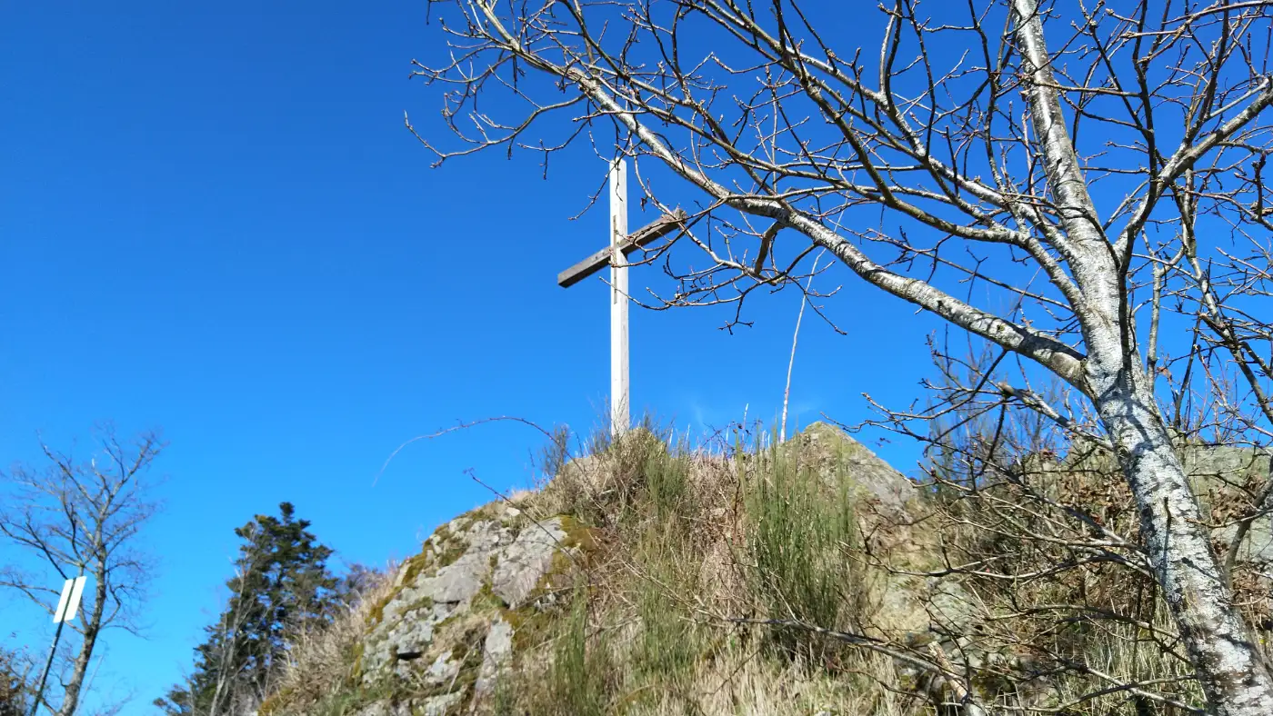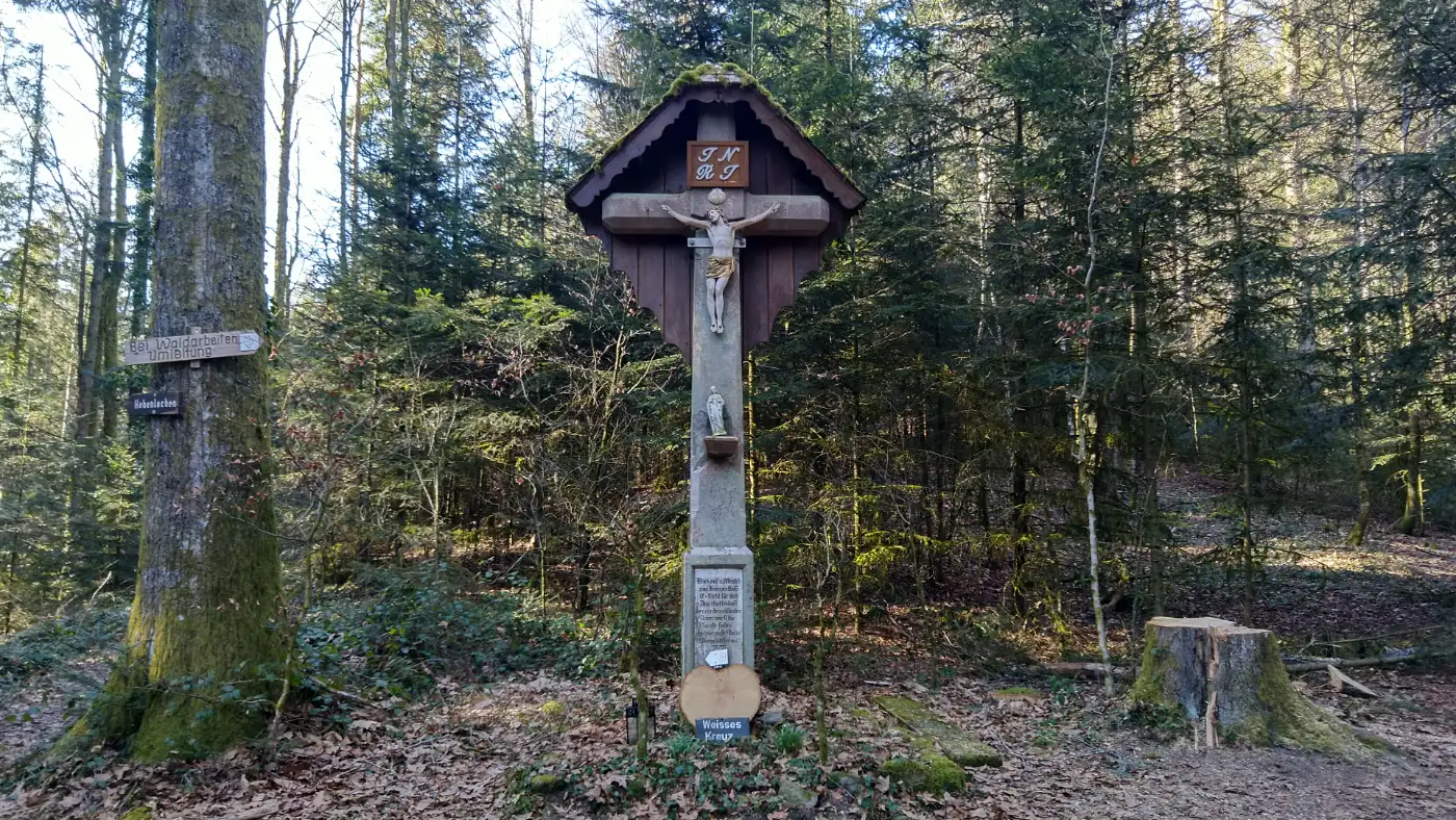 Nun beginnt der Abstieg, der uns zunächst am Weißen Kreuz vorbeiführt. Der Pfad schlängelt sich durch malerische Wiesen und idyllische Bauernhöfe, bis wir den letzten Aussichtspunkt unserer Tour erreichen: das Stuckhäusle. Von hier aus sind es nur noch etwa 20 Minuten zurück zum Bahnhof, wo unsere abwechslungsreiche Wanderung endet.Diese Tour wurde am 20.03.2025 von einer realen Person erwandert, fotografiert und beschrieben. Die GPS-Daten der Fotos wurden vor Ort erfasst und dienten zur exakten Rekonstruktion der Route.
